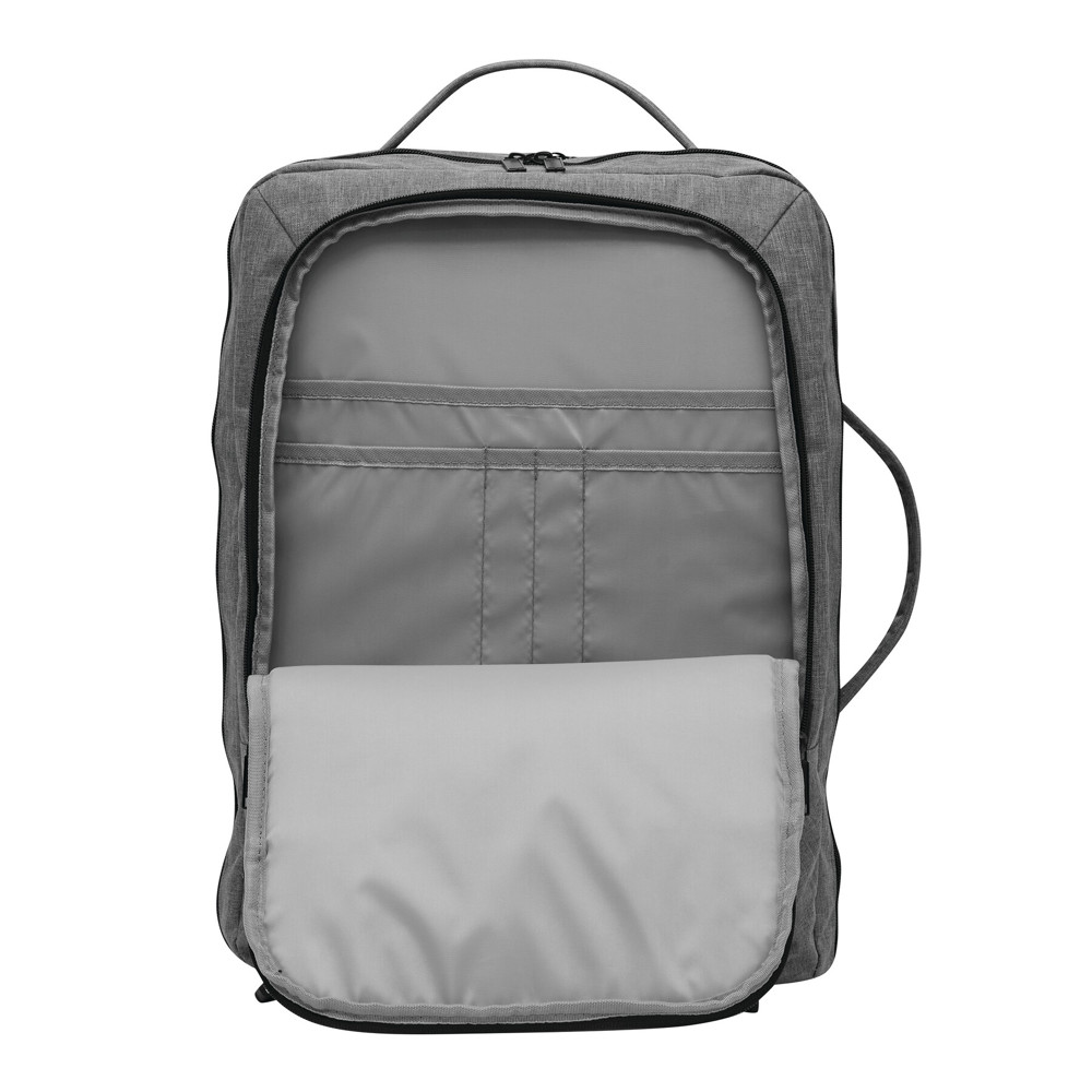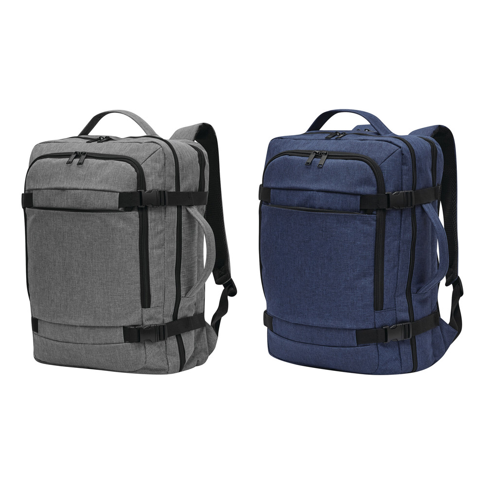 Rugzak STEWARD: 2 ritsvakjes aan de voorkant, waarvan één met organizer (3 steekvakken, 2 pennenlussen), 1 groot, gewatteerd hoofdvak met rits en elastische band, 1 gewatteerd laptopvak met rits, versterkte boven- en zijgrepen, gewatteerde schouderriemen in ergonomische vorm en gewatteerd rugpaneel, riem aan de achterkant voor reporterfunctie, aan beide zijden 2 compressiebanden met kliksluiting.