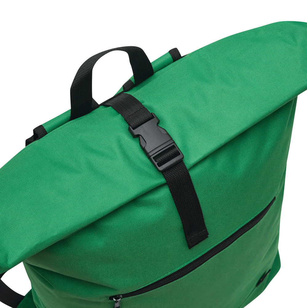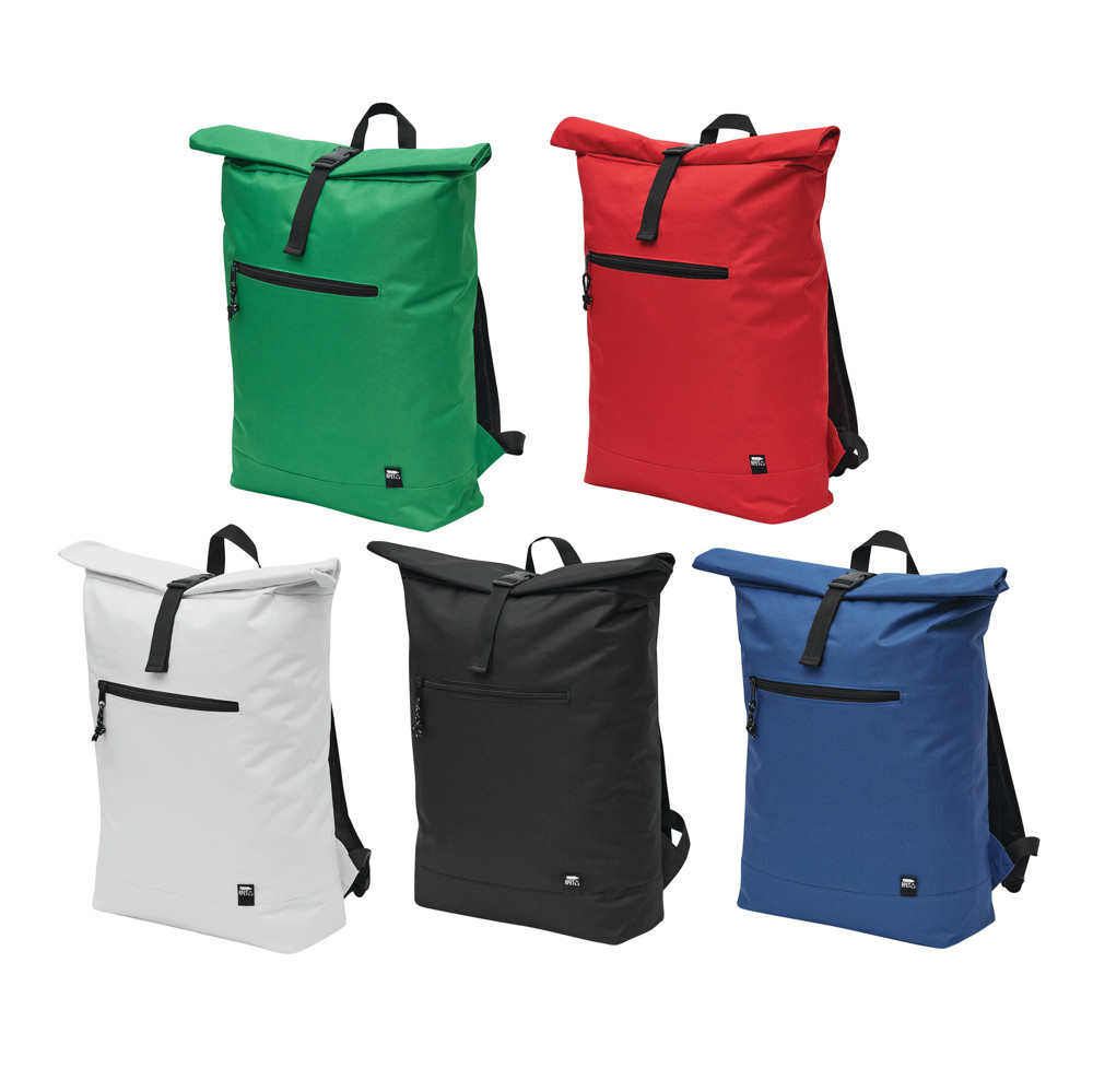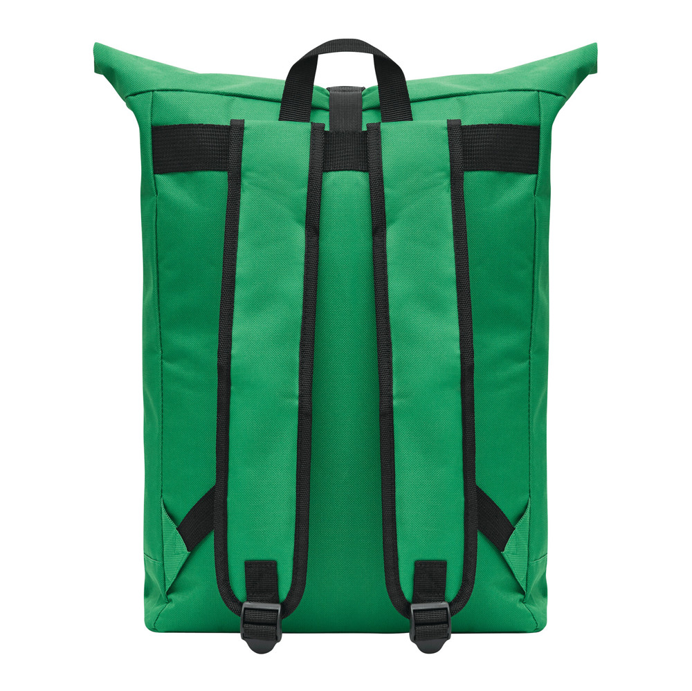 Rugtas ROLL-TOP: gemaakt van gerecycled kunststof (RPET), voorvak met horizontale ritssluiting, groot hoofdvak met gefoamd binnenvak voor laptop of tablet, kan worden opgerold en gesloten met een drukknoop, draagriem, gefoamde bodem, schouderbanden en rugpand.