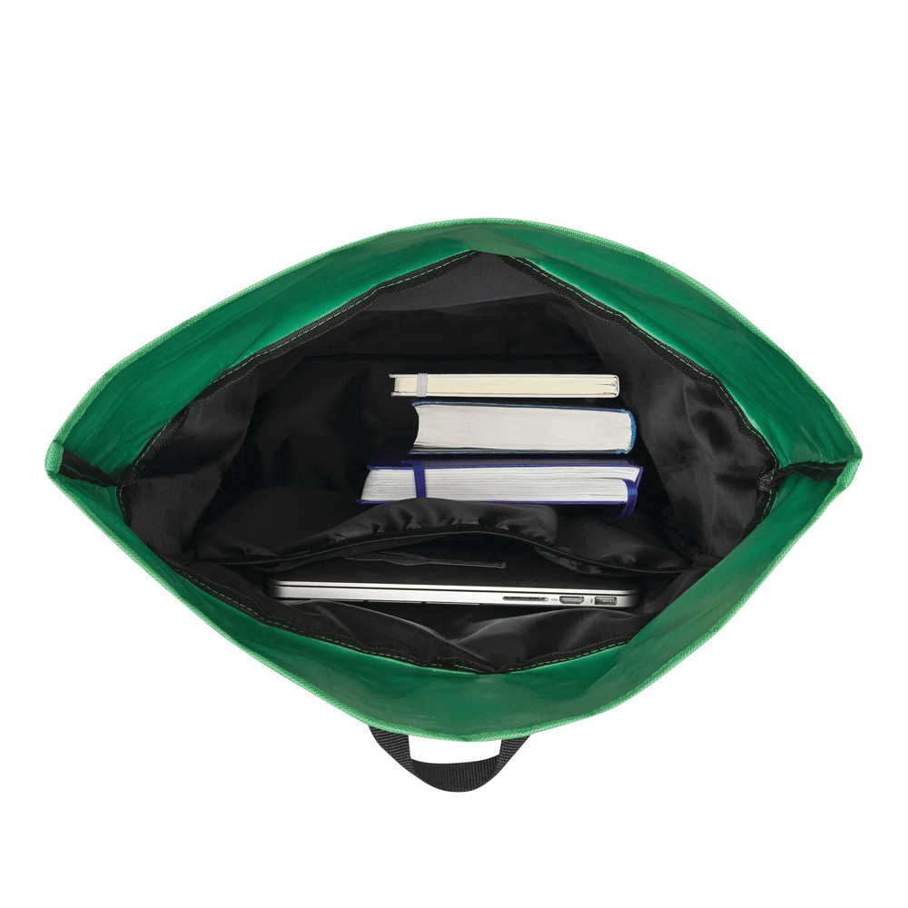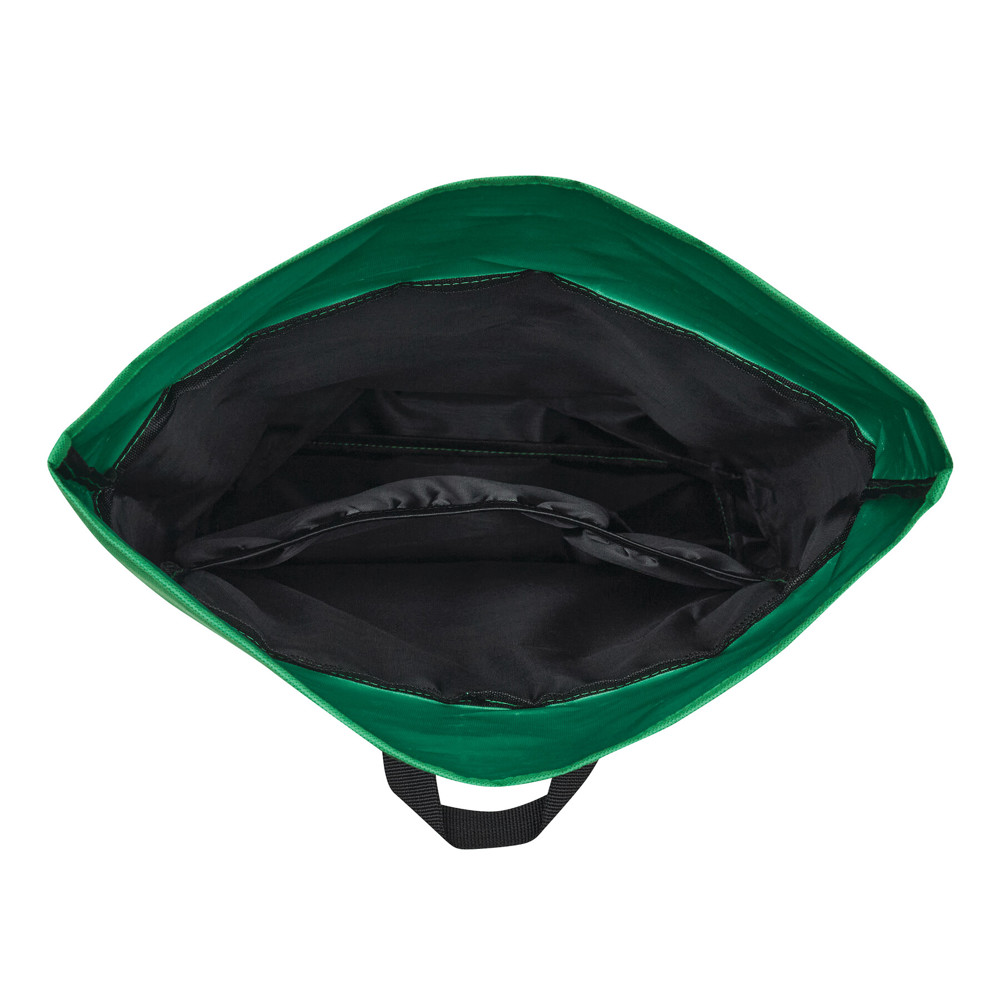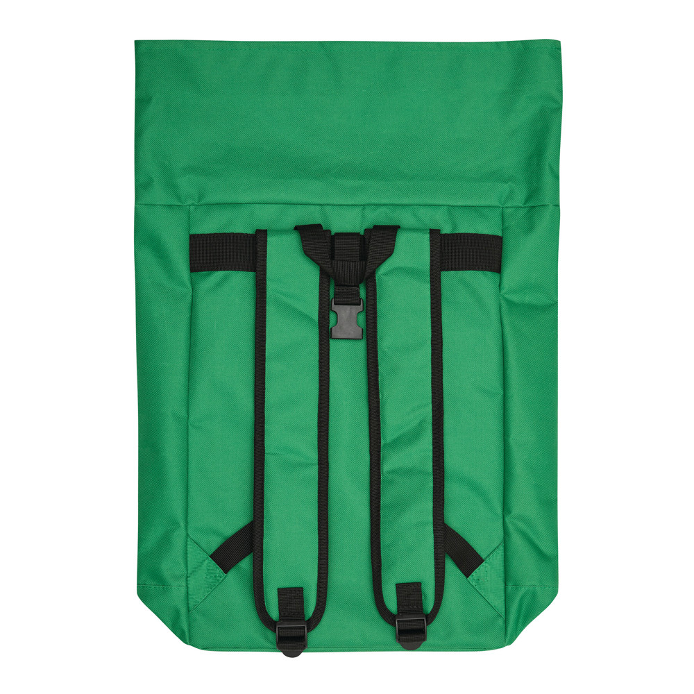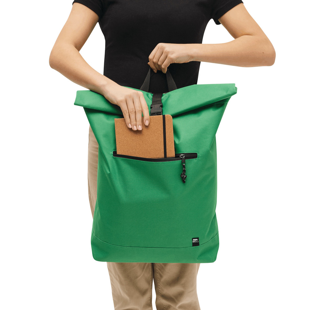 Rugtas ROLL-TOP: gemaakt van gerecycled kunststof (RPET), voorvak met horizontale ritssluiting, groot hoofdvak met gefoamd binnenvak voor laptop of tablet, kan worden opgerold en gesloten met een drukknoop, draagriem, gefoamde bodem, schouderbanden en rugpand.