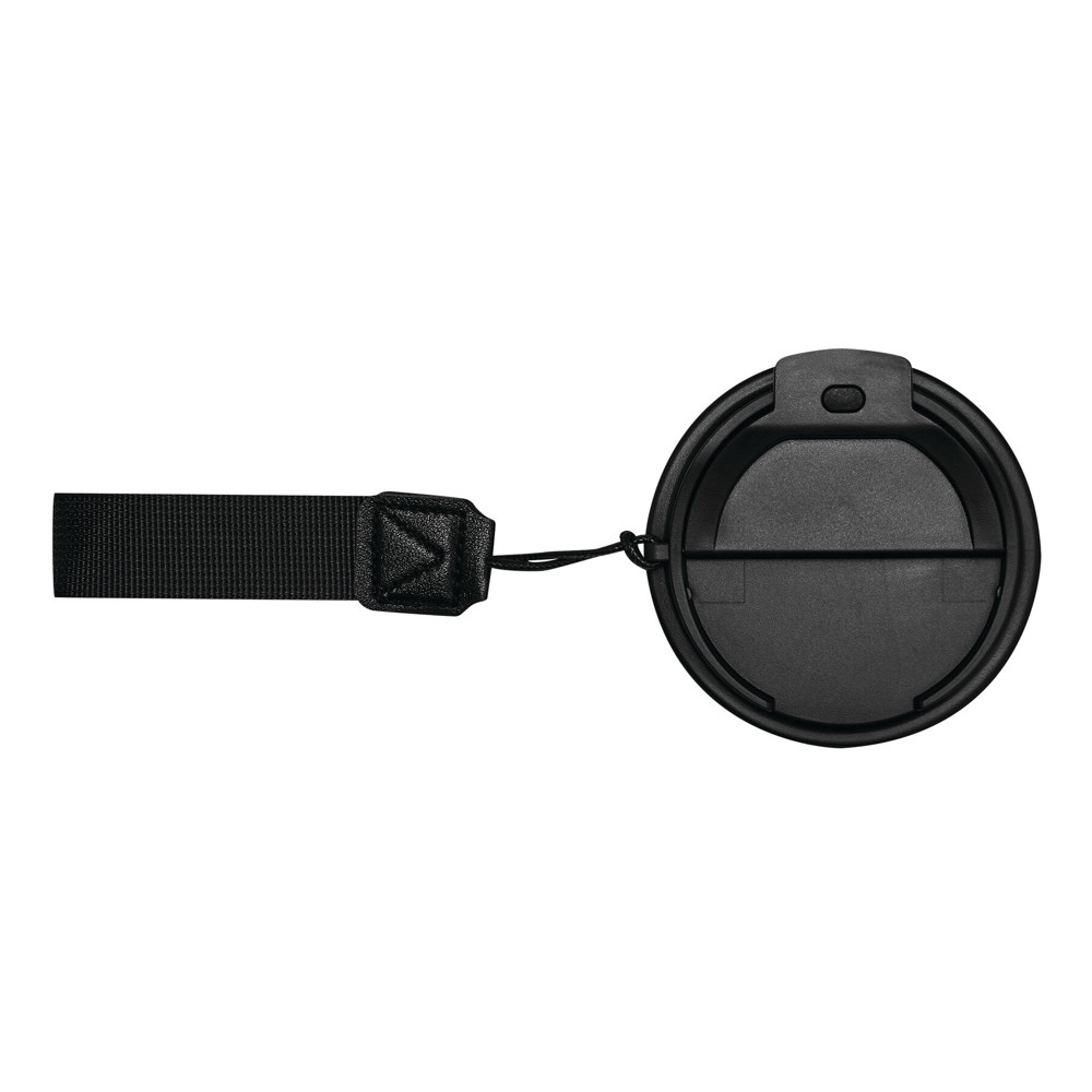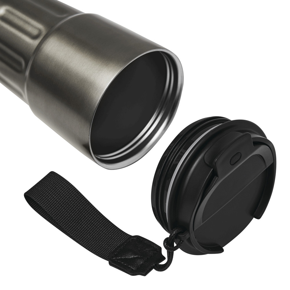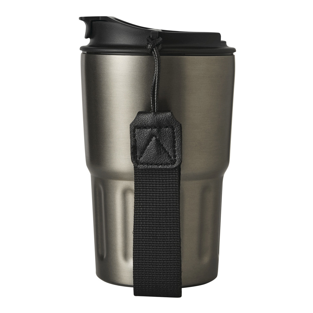 Isoleerbeker TRAVEL MUG, dubbelwandig: van binnen en van buiten gemaakt van RVS, matte poedercoating, kunststof deksel met veilige schroefdop, siliconen afdichting en geïntegreerde drinkopening, inhoud ca. 400 ml, met gerecyclede kunststof draaglus.