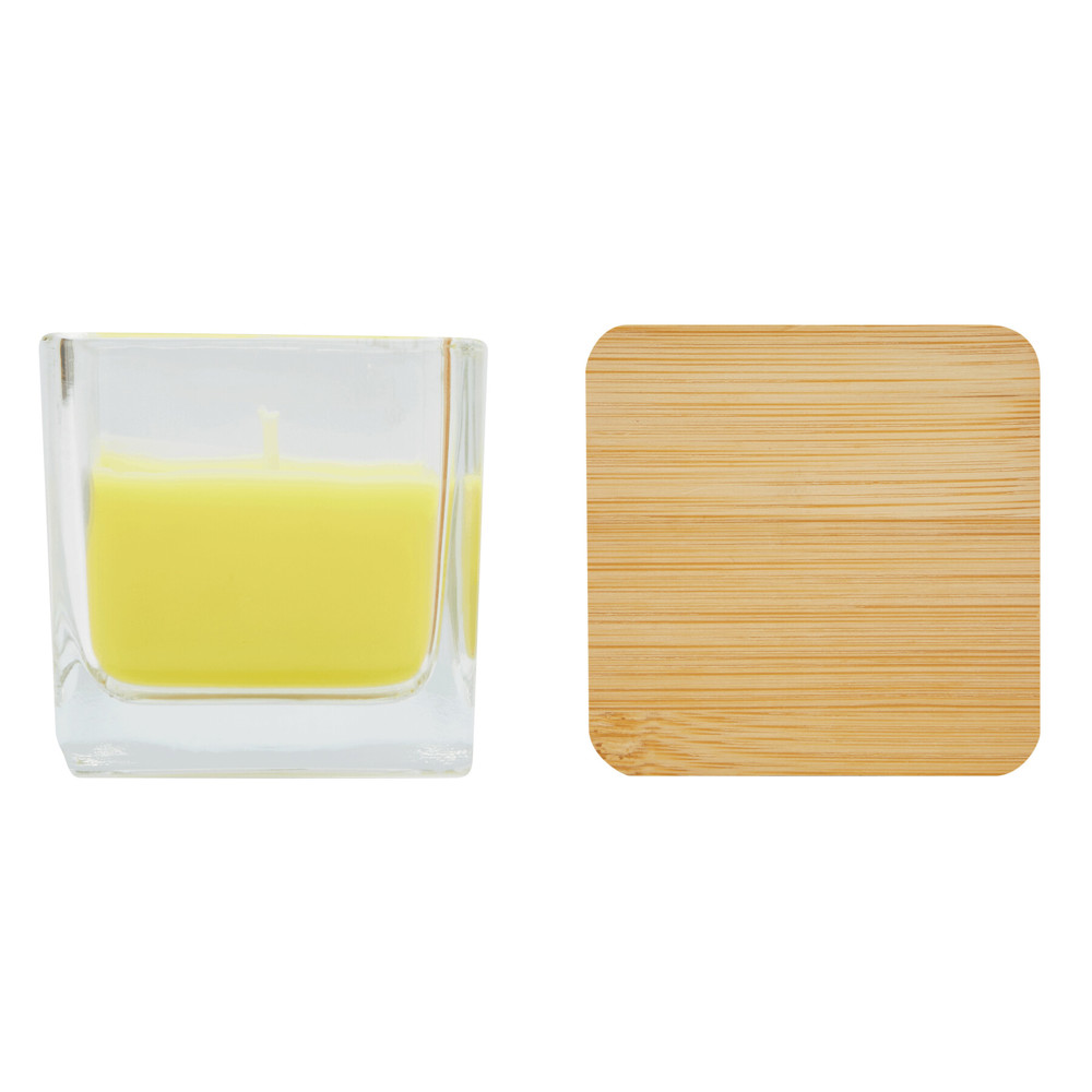 Geurkaars GLOW: in vierkant glas, gekleurde was met vanillegeur, bamboe deksel met siliconen...meer