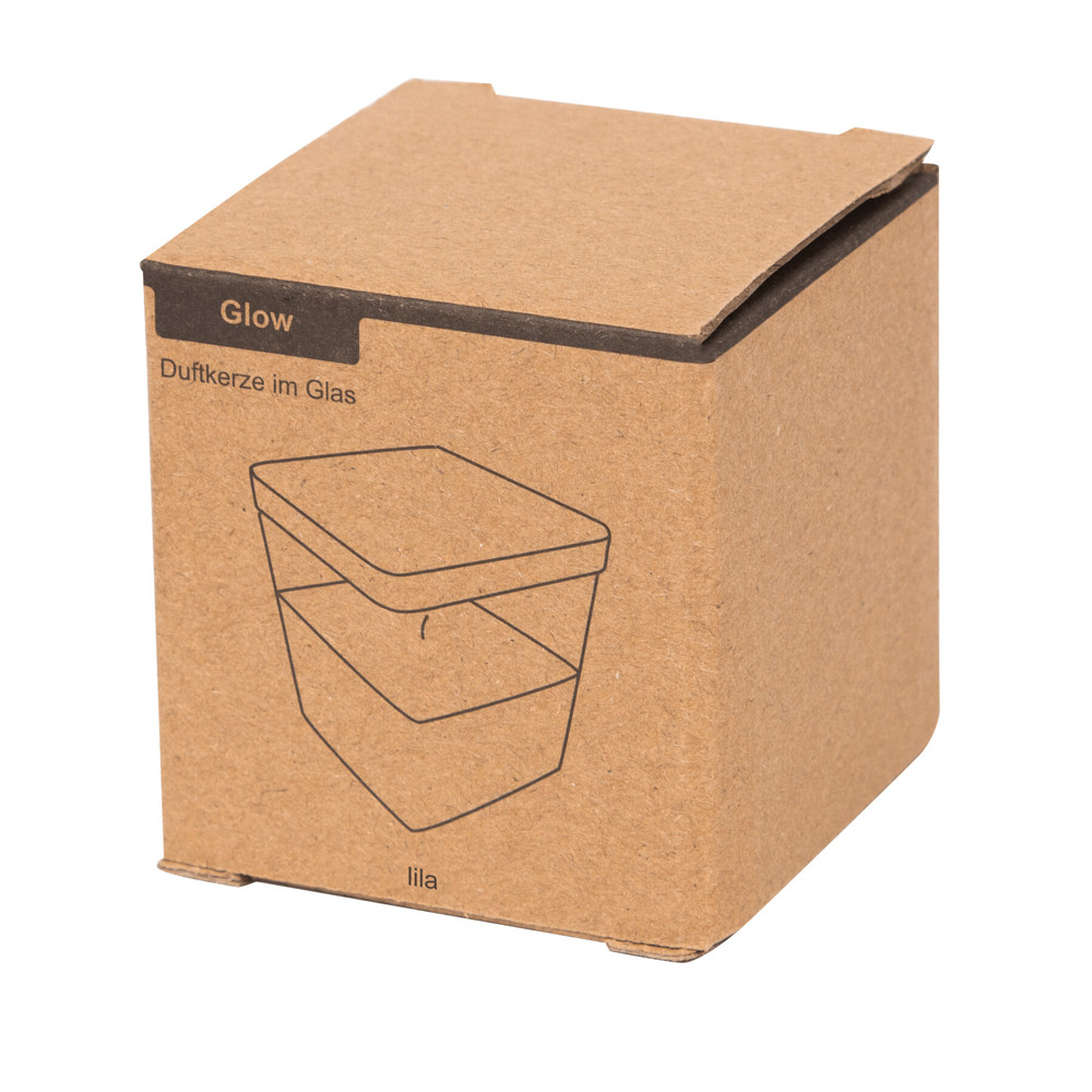 Geurkaars GLOW: in vierkant glas, gekleurde was met vanillegeur, bamboe deksel met siliconen afsluitring, brandtijd ca. 8 uur.