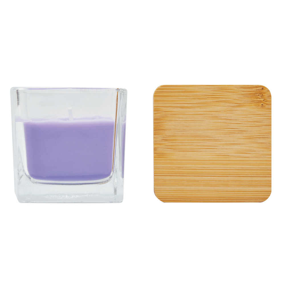 Geurkaars GLOW: in vierkant glas, gekleurde was met vanillegeur, bamboe deksel met siliconen...meer