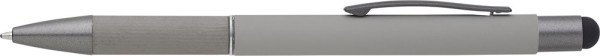Aluminium balpen met gerold papier details op de grip. Rubberen tip voor capacitieve schermen. Blauwe inkt.