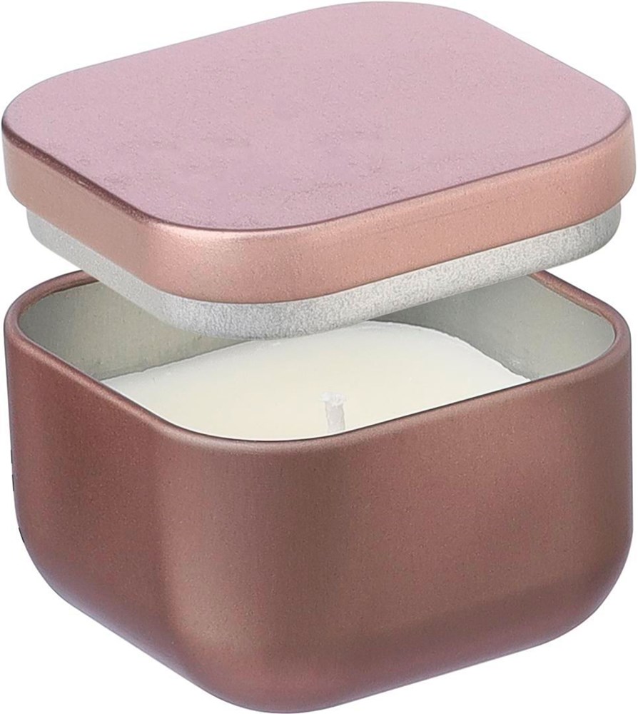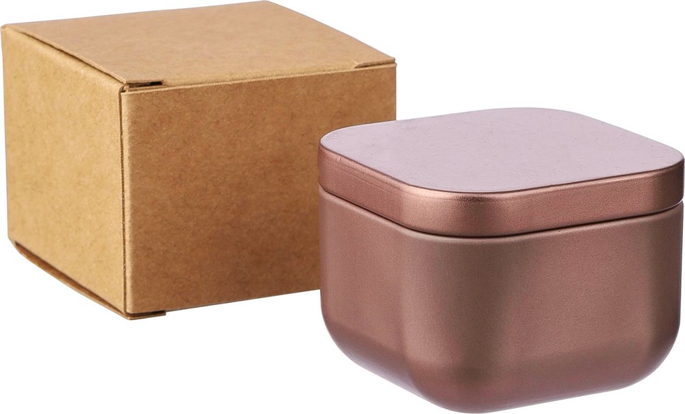 Metalen kaars met vanille geur in een metalen pot met metalen deksel. Bevat 40 gram was. Brandtijd ca. 10 uur. Per stuk verpakt in bruin kartonnen doosje.