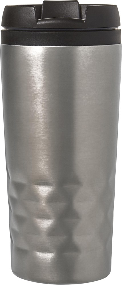 Roestvrijstalen reismok (300 ml) met zwarte deksel. Ook verkrijgbaar in gekleurd roestvrijstaal. De mok is dubbelwandig en de drinkopening heeft een klep.