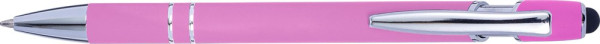 Balpen met rubberen toplaag en stylus. De tip en clip zijn van zilverkleurige kunststof. Blauwschrijvend.