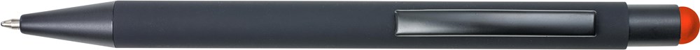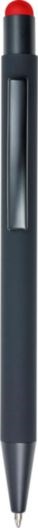 ABS en aluminium balpen, blauwschrijvend, met rubberen coating. De onderlaag van de houder en rubberen stylus top zijn gekleurd. Bij graveren zal het logo dezelfde kleur hebben als de top.