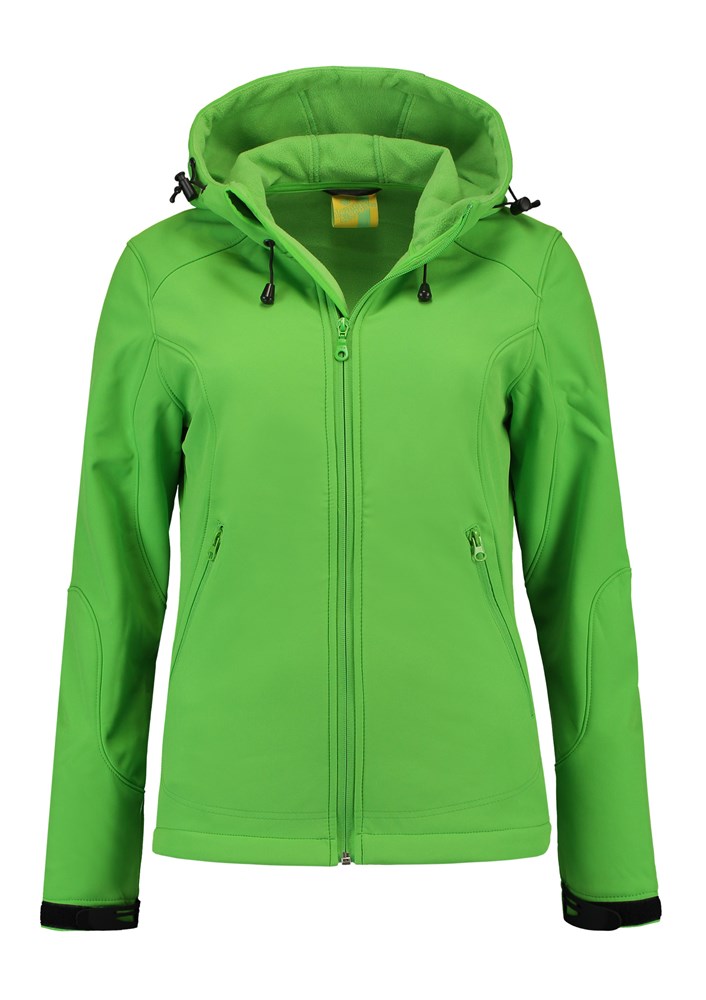 Lemon & Soda softshell jack voor dames met capuchon en twee zakken met rits van een hoogwaardige kwaliteit. Softshell is te borduren en hierdoor is het jack in te zetten als gepersonaliseerde promotiekleding of bedrijfskleding.