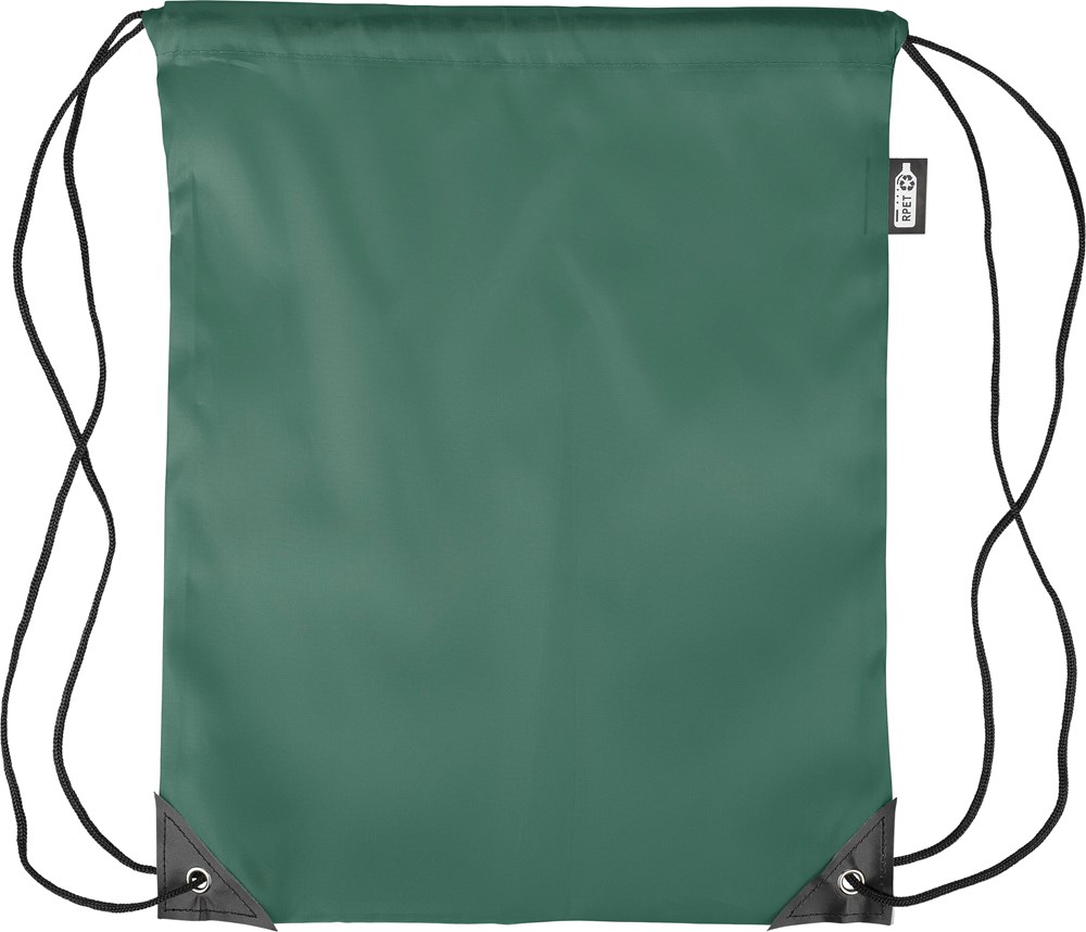 rPET polyester (210D) trekkoord rugtas met twee zwarte PU-hoeken aan de voorkant en met stiksels aan de binnenkant. Voorzien van een zwarte nylon koord aan elke zijde, een trekkoordsluiting. Capaciteit: 5 L. Draagvermogen: 7 kg. Inclusief rPET-label.