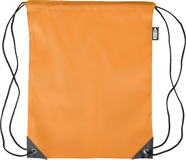 rPET polyester (210D) trekkoord rugtas met twee zwarte PU-hoeken aan de voorkant en met stiksels aan de binnenkant. Voorzien van een zwarte nylon koord aan elke zijde, een trekkoordsluiting. Capaciteit: 5 L. Draagvermogen: 7 kg. Inclusief rPET-label.