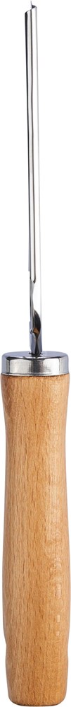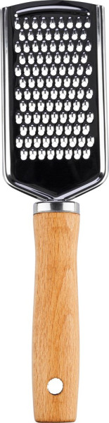 Houten rasp met roestvrijstalen onderdelen (430-grade rasp en 410-grade houder). Voorzien van een opening in het handvat voor ophangen. Verpakt in bulk met tissuepapier rond het metalen deel.