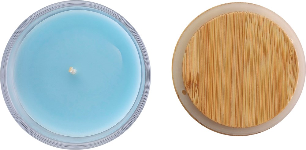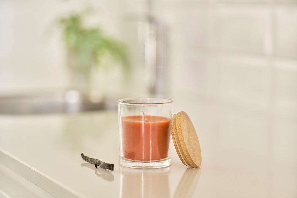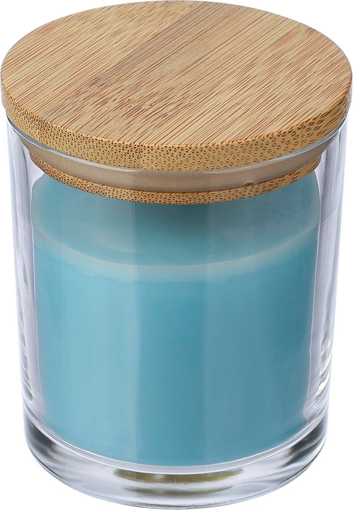Glazen kaars met 120 gram gekleurde was en een vanillegeur, in een transparante glazen houder met bamboedeksel. Heeft ongeveer 20 branduren. Per stuk verpakt in een witte kartonnen koker.