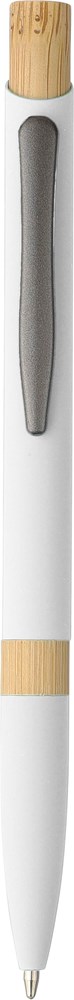 Gerecyclede aluminium balpen met een rubberen afwerking, bamboe drukknop en bamboe ring in de penhouder. Voorzien van een drukmechanisme, een 1,0 mm schrijfpunt en blauwe inkt met een schrijfafstand van ongeveer 800 meter. Inclusief een gegraveerd logo van gerecycled aluminium.