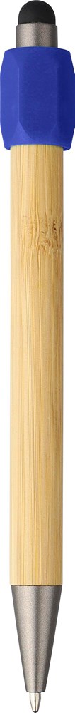 Bamboe balpen met spinnerfunctie, gemaakt van gerecycled ABS, en voorzien van een zwarte styluspunt op de drukknop. Uitgerust met een drukmechanisme, een 1,0 mm schrijfpunt en blauwe inkt met een schrijfafstand van ongeveer 800 meter. Inclusief een logo van gerecycled ABS.