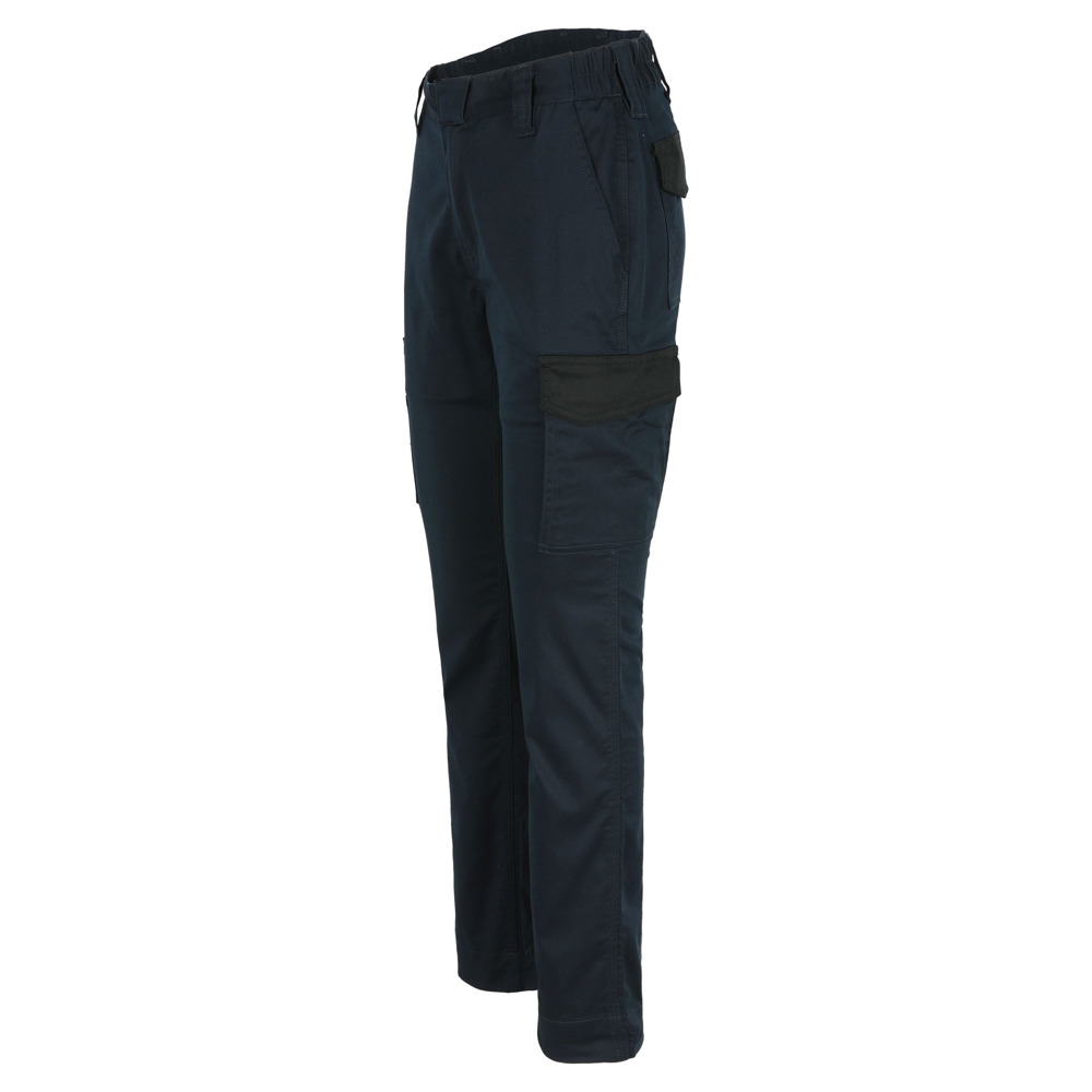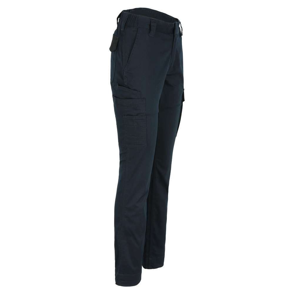 Multi-pocket slim fit damesbroek in 2-weegs stretch Waterafstotende coating Elastische tailleband Verborgen knop Verhoogde tailleband achteraan 2 zijzakken 1 extra zijzak met rits 1 grote GSM-zak in de dijbeenzak links 1 dijbeenzak met pennenzakjes 1 meterzak 2 achterzakken Uitneembare zoom (5cm) EN ISO 13688:2013 EN ISO 15797:2004/AC:2004