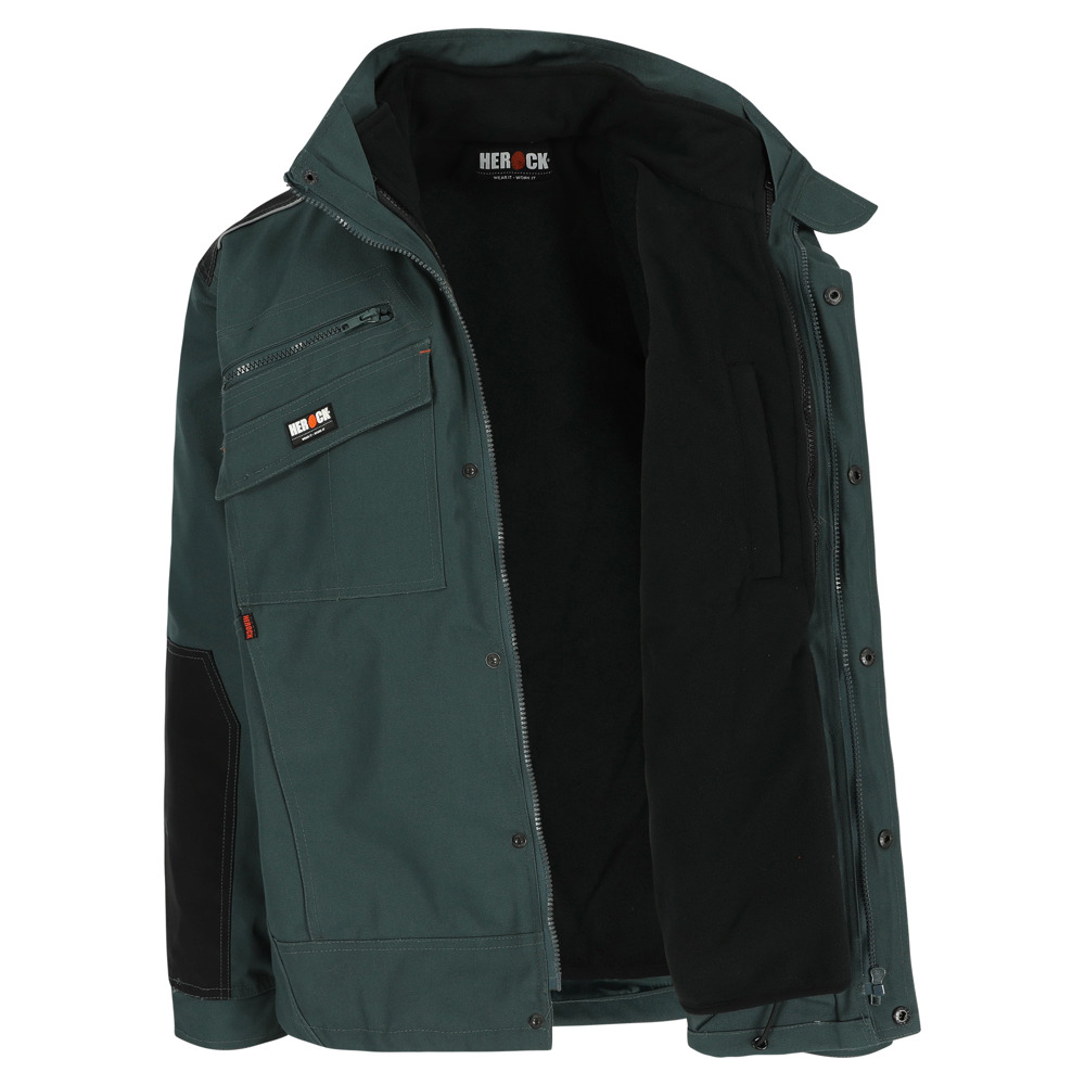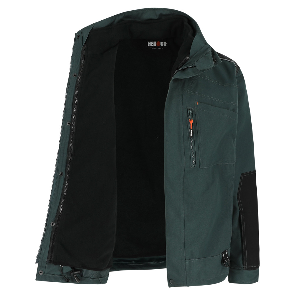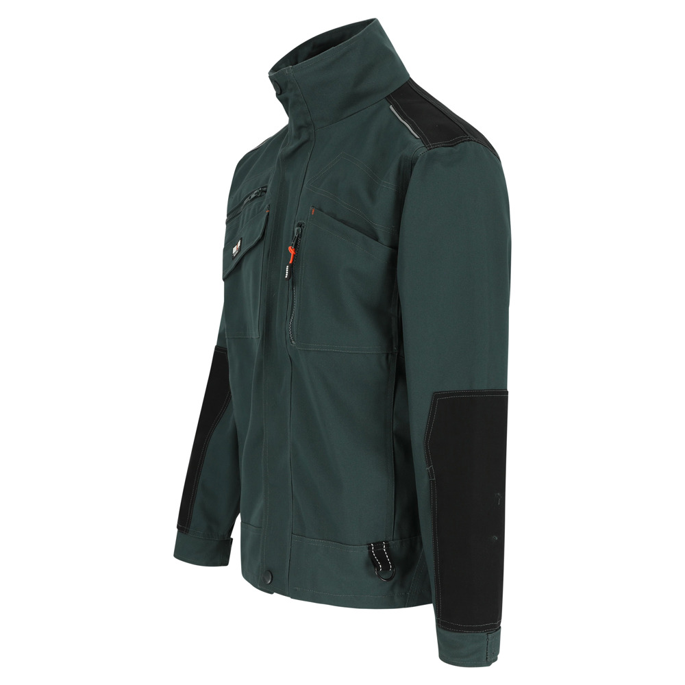 Multi-pocket ademende en waterdichte jas met uitneembare ademende en winddichte bodywarmer Buitenkant jas: Ademend 3000 mvp Waterdicht 8000 mm Getapete naden Versterkingen op schouders en armen met reflecterende piping 4 borstzakken 2 zijzakken 1 taillelus met sleutelring 2 binnenzakken Verstelbare manchetten Elastisch trekkoord onderaan Uitneembare winddichte bodywarmer: Ademend 2000 mvp 1 borstzak 2 zijzakken EN ISO 15797:2004/AC:2004