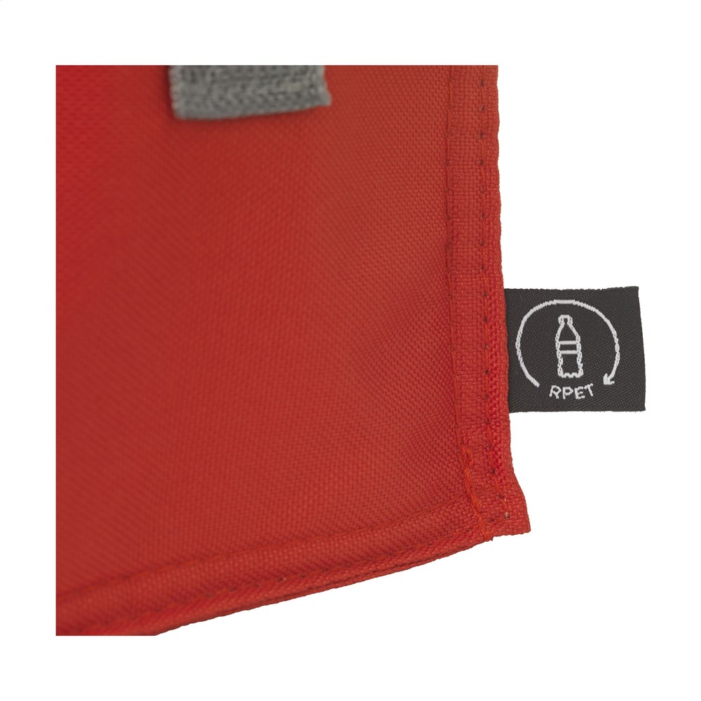 Koeltasje van 600D RPET polyester. Geschikt voor 6 blikjes drank. Met draagriem. GRS-gecertificeerd. Totaal gerecycled materiaal: 51%. Inhoud ca. 3 liter.