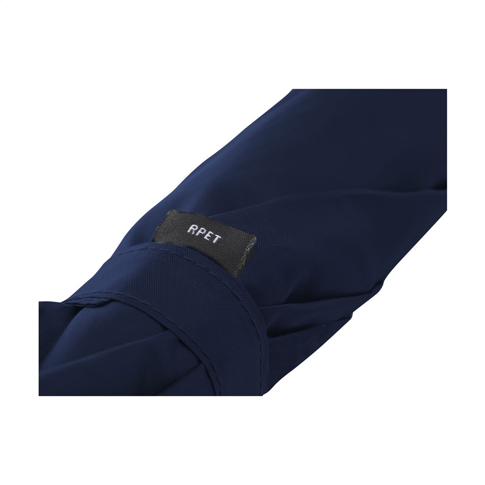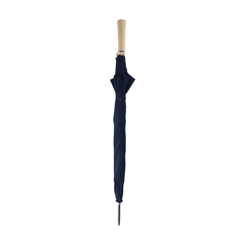 Paraplu met een RPET 190T pongee polyester bespanning. Deze paraplu heeft een metalen steel en een glasvezel frame. Met houten handgreep en klittenbandsluiting. RCS-gecertificeerd. Totaal gerecycled materiaal: 16%.