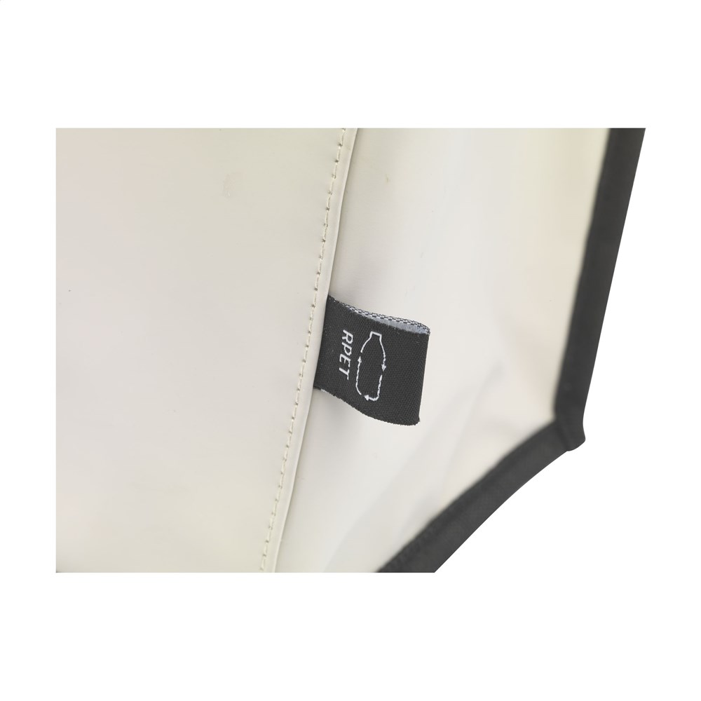 Stevige en stoere koeltas gemaakt van waterafstotend PU, 7% gerecycled PU en 15% gerecycled polyester. Het materiaal kan tegen een stootje en is bovendien gemakkelijk schoon te houden. De binnenzijde van de tas is bekleed met aluminiumfolie voor het koelhouden van de inhoud. De koeltas heeft een ritssluiting en twee stevige handgrepen. Aan de voorzijde zit een extra opbergvak - handig voor je telefoon, portemonnee of iets anders dat niet koel bewaard hoeft te worden. RCS-gecertificeerd. Totaal gerecycled materiaal: 22%. Inhoud ca. 9 liter.