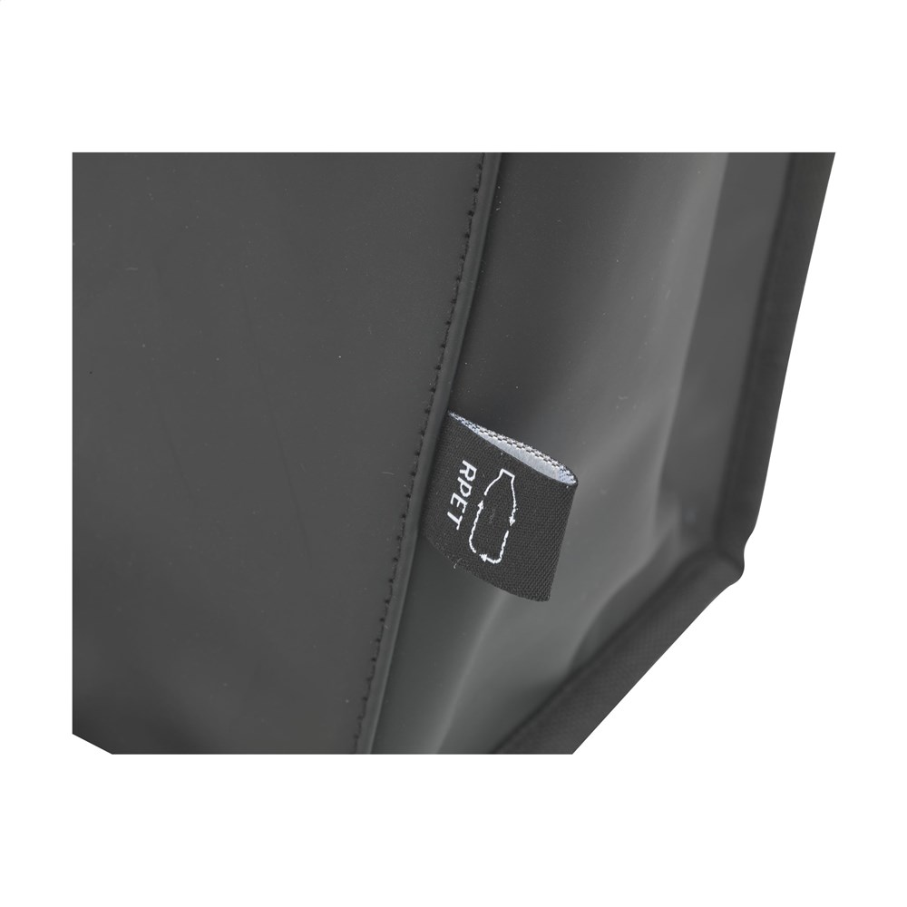 Stevige en stoere koeltas gemaakt van waterafstotend PU, 7% gerecycled PU en 15% gerecycled polyester. Het materiaal kan tegen een stootje en is bovendien gemakkelijk schoon te houden. De binnenzijde van de tas is bekleed met aluminiumfolie voor het koelhouden van de inhoud. De koeltas heeft een ritssluiting en twee stevige handgrepen. Aan de voorzijde zit een extra opbergvak - handig voor je telefoon, portemonnee of iets anders dat niet koel bewaard hoeft te worden. RCS-gecertificeerd. Totaal gerecycled materiaal: 22%. Inhoud ca. 9 liter.