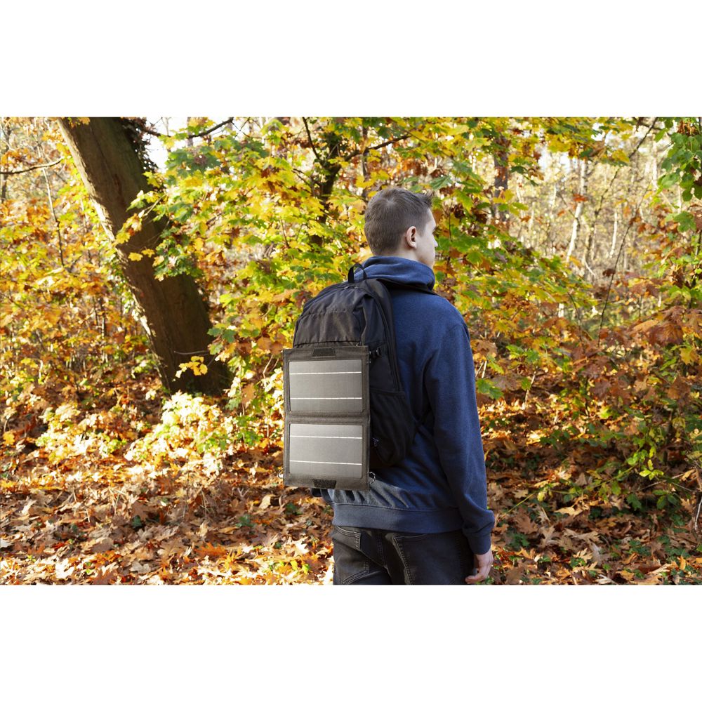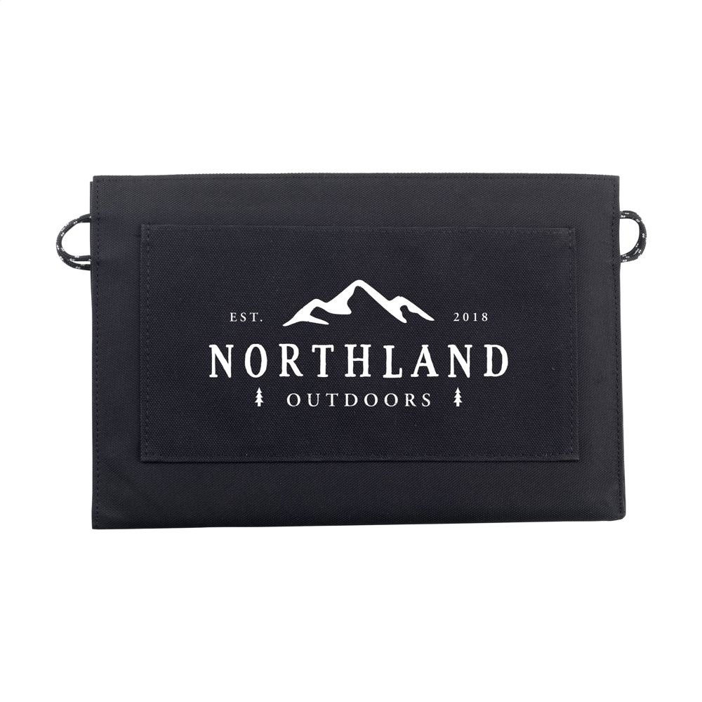 Oplader (10W) met solarpaneel, verwerkt in een pouch van 600D RPET. De pouch heeft 2 ophangogen en je kunt hem open- en dichtklappen. Voorzien van een klittenbandsluiting. Gemakkelijk mee te nemen en te verplaatsen. Het solarpaneel kan direct worden gebruikt voor het opladen van je telefoon of andere devices, zonder gebruik van een extra externe batterij. Sluit je mobiele telefoon aan op het solarpaneel en plaats het paneel in de zon. Vermogen 10W - 5V/2A. Input: USB-A en Type-C. Ideaal voor reizigers, op boten, in campers en op plekken waar geen elektriciteit voorhanden is. Afm. opengeklapt: 29,5 x 34,6 x 0,8 cm. Per stuk verpakt.