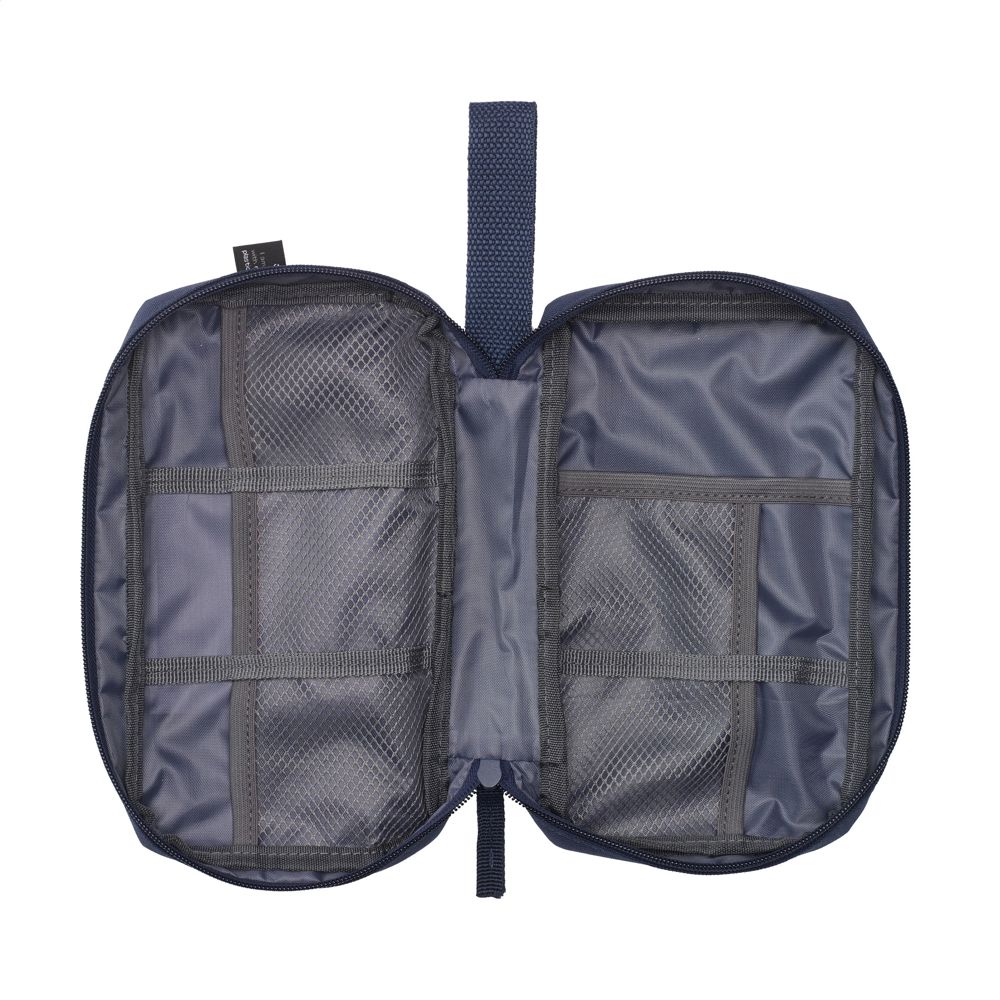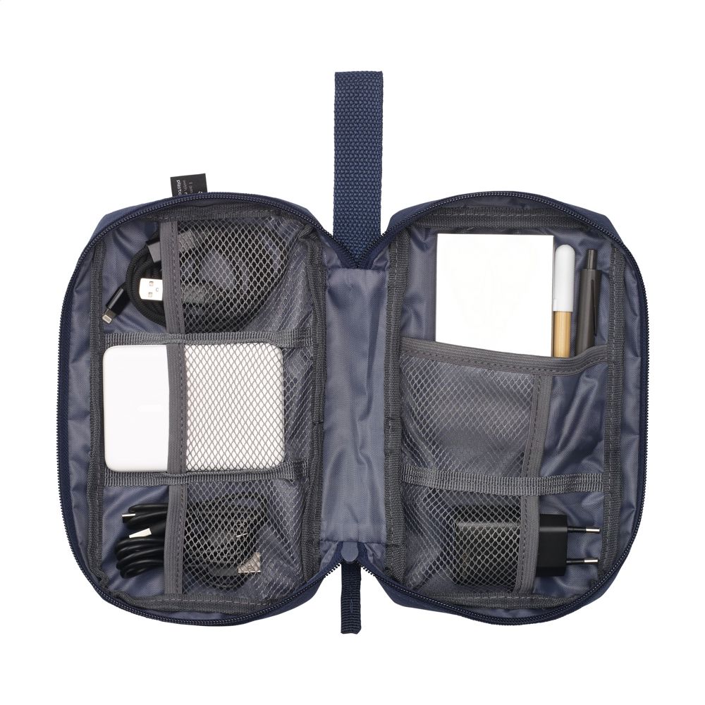 Etui voor het georganiseerd en overzichtelijk opbergen van kabels, opladers en technische accessoires. Gemaakt van 600D RPET polyester. De binnenzijde biedt ruime opbergmogelijkheden, verdeeld over verschillende (mesh) vakken. Met ritssluiting, een extra ritsvak aan de buitenzijde en een praktische draaglus. Ideaal om mee te nemen op reis, maar ook handig voor thuis of op kantoor. GRS-gecertificeerd. Totaal gerecycled materiaal: 88%.