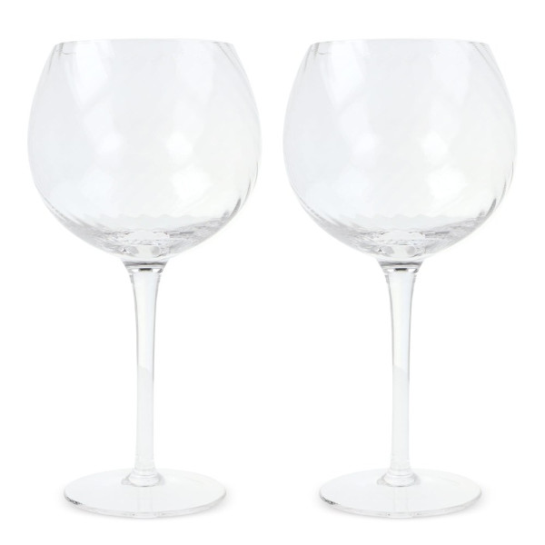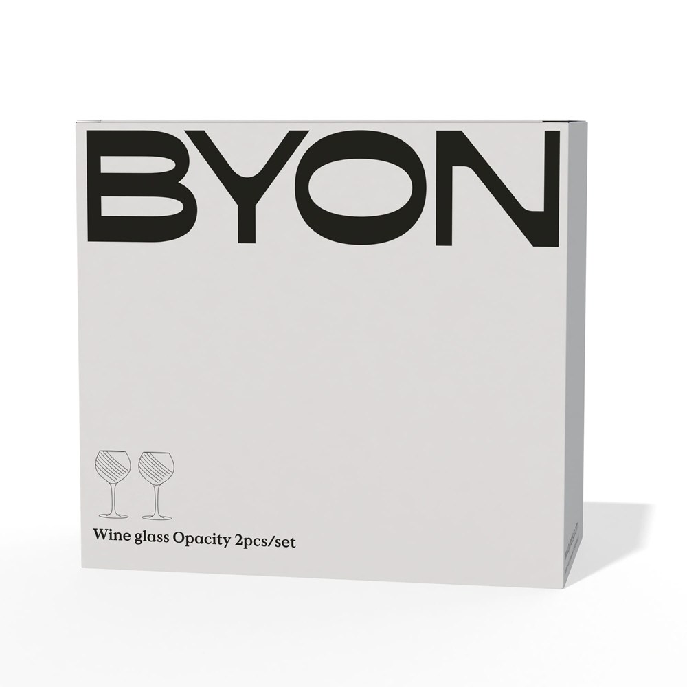 De twee Opacity Wijnglazen zijn gemaakt van helder glas en hebben een prachtig gesponnen glaspatroon. Het zijn dunne en heldere wijnglazen met een perfect contrast tussen luxe en eigenwijsheid. Ontwerp door Studio Byon. Geleverd in geschenkdoos.