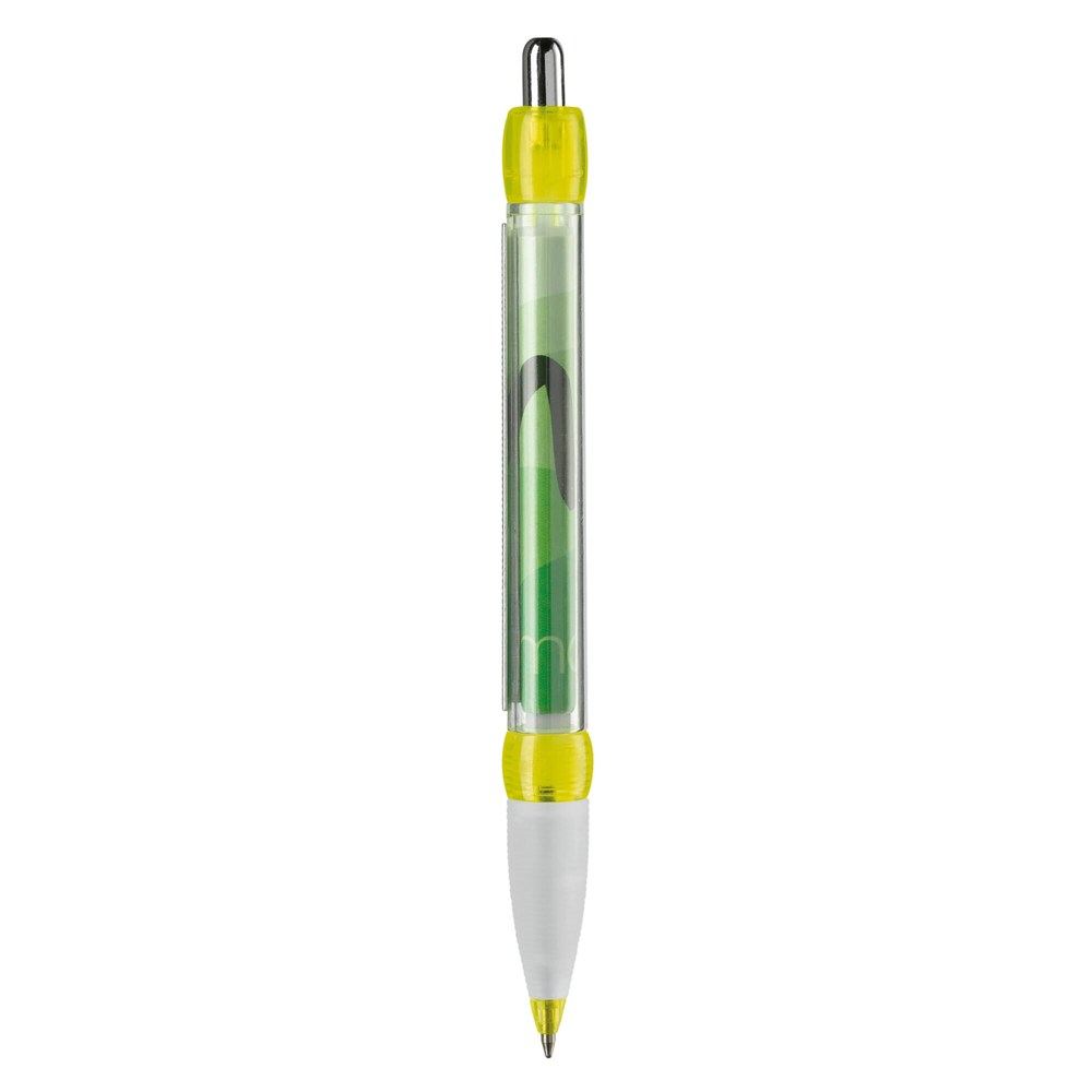 Transparante balpen met rubberen grip. Met full-colour banner bedrukking aan twee zijden. Blauwschrijvende X20 vulling. Bedrukking op de houder of clip mogelijk.