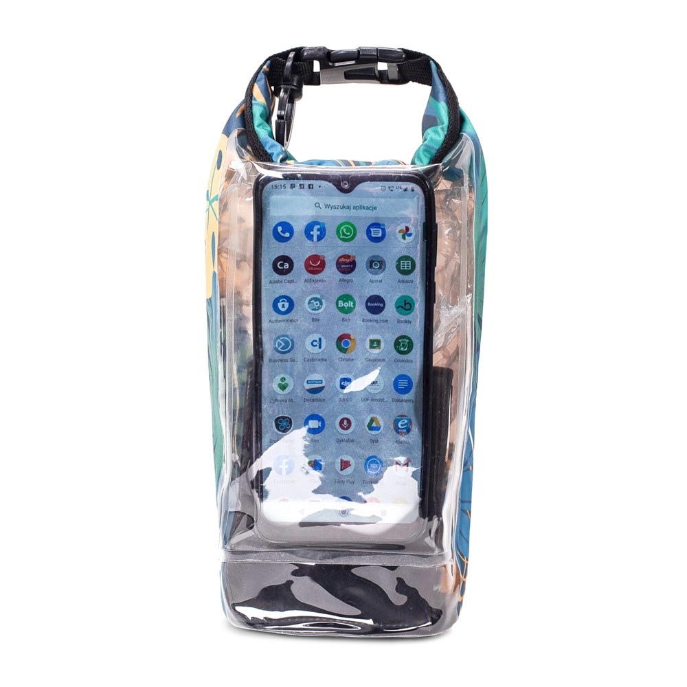Waterafstotende tas met een vakje voor de smartphone. De telefoon kan bediend worden terwijl deze beschermd tegen zand en water in de tas zit. Ideaal voor op het strand of bij het zwembad. Deze tas wordt naar wens gemaakt en kan all-over bedrukt worden. Korte levertijden. Waterafstotend IPX6, bestand tegen hoge druk waterstromen uit alle richtingen. Houd de tas niet onder water.