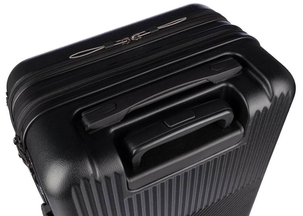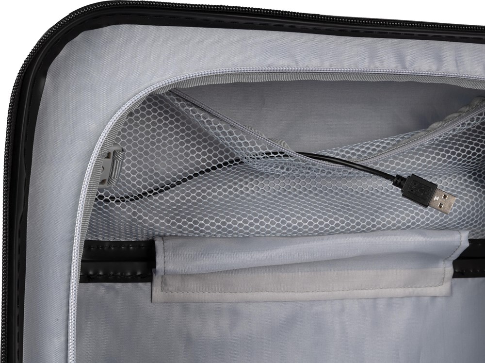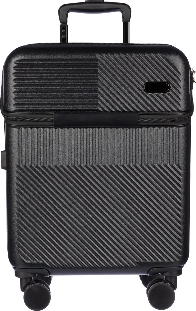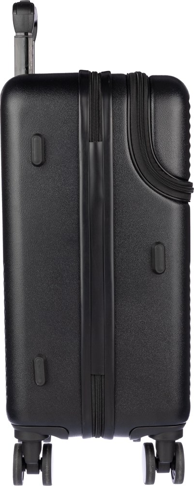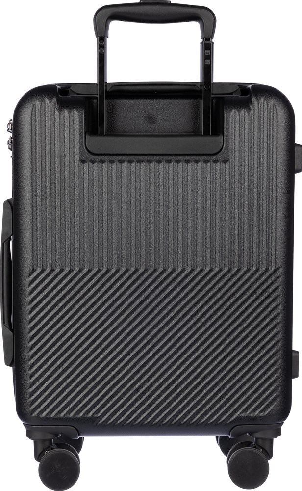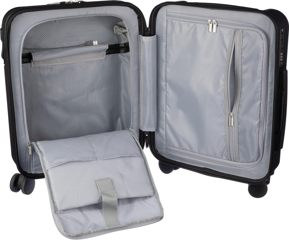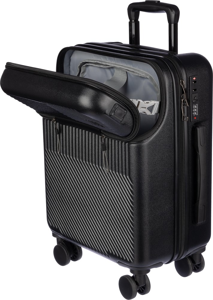 ABS handbagagetrolley (20 inch) met voorvak met ritssluiting voor laptop, 8 wielen en een handvat met drie standen. Voorzien van cijferslot en apart plaatje voor lasergravure. Met USB-poort.