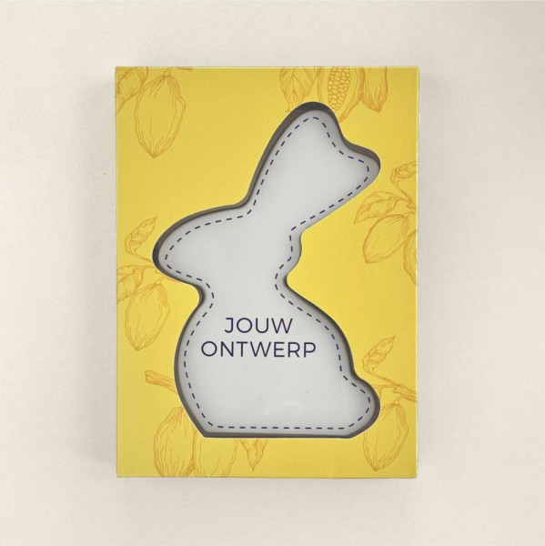 Feestelijk en persoonlijk. Bedruk jouw eigen paashaas naar wens. Een persoonlijk bedrukte paashaas in een mooie geschenkverpakking. Gemaakt van melkchocolade, afgewerkt met een dun laagje wit, waarop jouw eigen bedrukking is aangebracht; het ultieme paascadeau. Van één stuk tot …duizend stuks, wij regelen het.