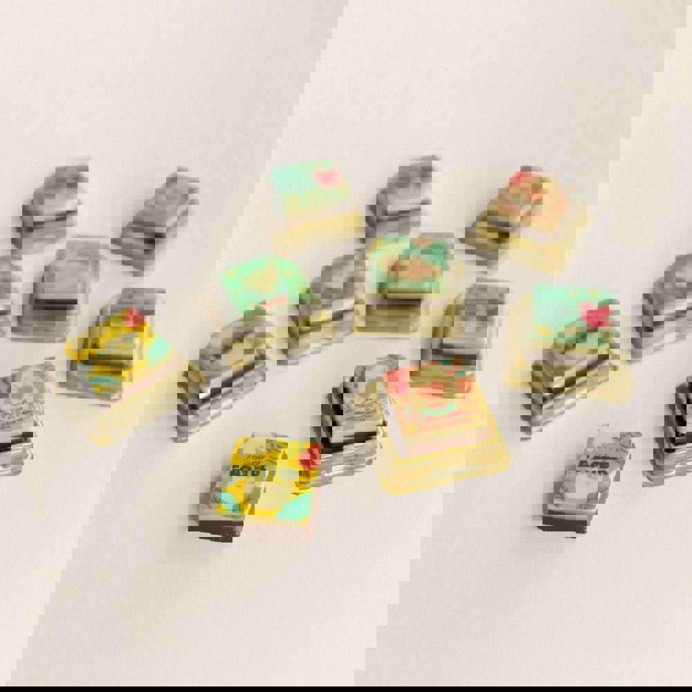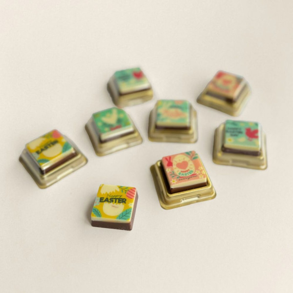 Bedrukte chocolaatjes in een individuele verpakking. Een doos, verschillende designs assorti, die je per stuk uit kunt delen, serveren bij de koffie of op de balie kunt zetten bij de receptie. Heerlijk!
