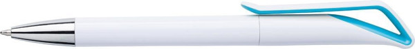 Kunststof balpen met gekleurde elementen, blauwschrijvend, met de clip in de vorm van een geometrische zwanenhals, met draaimechanisme.