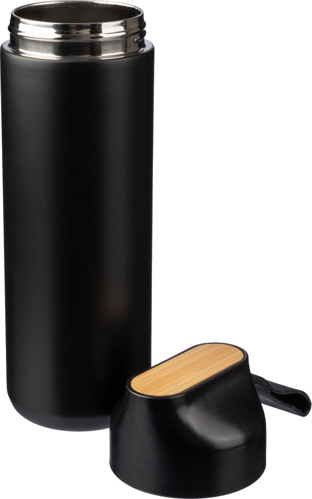 Zwarte kartonnen geschenkset met 3 artikelen: een roestvrijstalen vacuümgeïsoleerde dubbelwandige drinkfles (640 ml) met een PP deksel, siliconen band en bamboe detail op de bovenkant. De binnenkant is van roestvrij staal 304, de buitenkant van roestvrij staal 201; een aluminium draaibalpen met een matte afwerking, blauwschrijvend en een bamboe detail op de clip; en een rPET (300D) notitieboekje (ca. A5) met 80 gelinieerde pagina’s (70 gram) en een opvouwbare kaft die verandert in een telefoonhouder, met bamboe detail op de kaft.