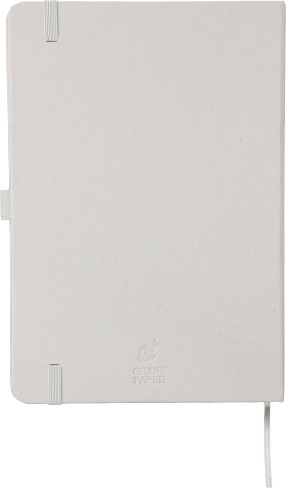 Gerecycled bioafval en kartonnen notitieboekje (ca. A5) met 80 gelinieerde pagina’s (bedrukt met soja-inkt). Inclusief reliëf op de achterkant per kleur van het gebruikte afval: groen voor citrus, rood voor kers, blauw voor lavendel, kaki voor druiven en lichtbruin voor hazelnoot. Het notitieboek heeft een Favini papieren omslag (afkomstig uit Italië) en 70 grams papier.