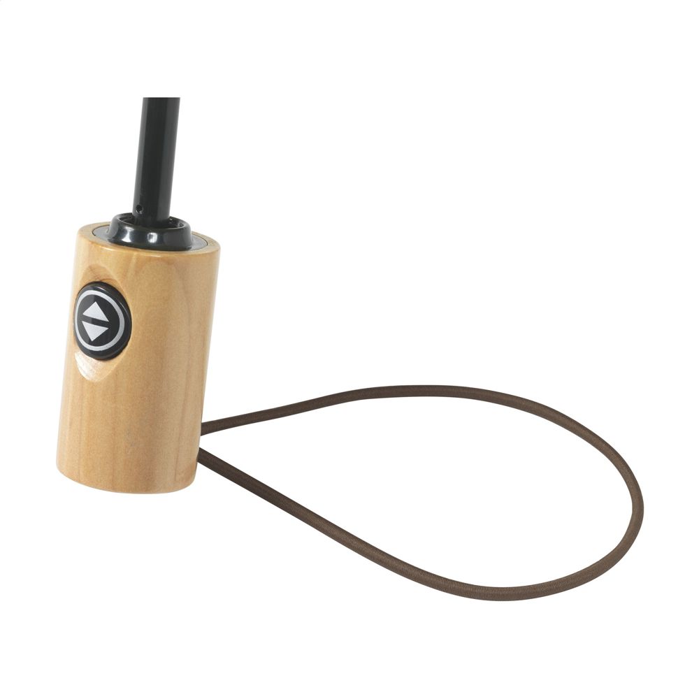 Opvouwbare paraplu met automatisch open- en sluitmechanisme. Met een RPET 190T pongee polyester bespanning. Deze paraplu heeft een RVS frame en steel, houten handgreep, elastische lus en klittenbandsluiting. In opberghoes. Afm. dichtgevouwen: Ø 6 x 28,5 cm. RCS-gecertificeerd. Totaal gerecycled materiaal: 16%.