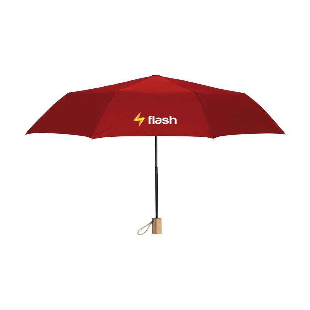 Opvouwbare paraplu met 190T RPET pongee polyester bespanning. Met RVS frame en steel, mooie bamboe handgreep met katoenen lus, klittenbandsluiting, opberghoes en RPET label. Manuele bediening. RCS-gecertificeerd. Totaal gerecycled materiaal: 18%.