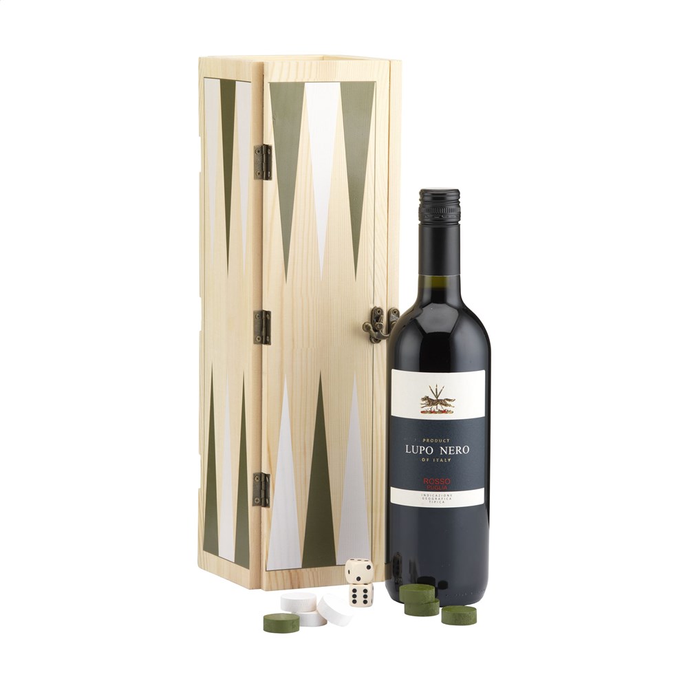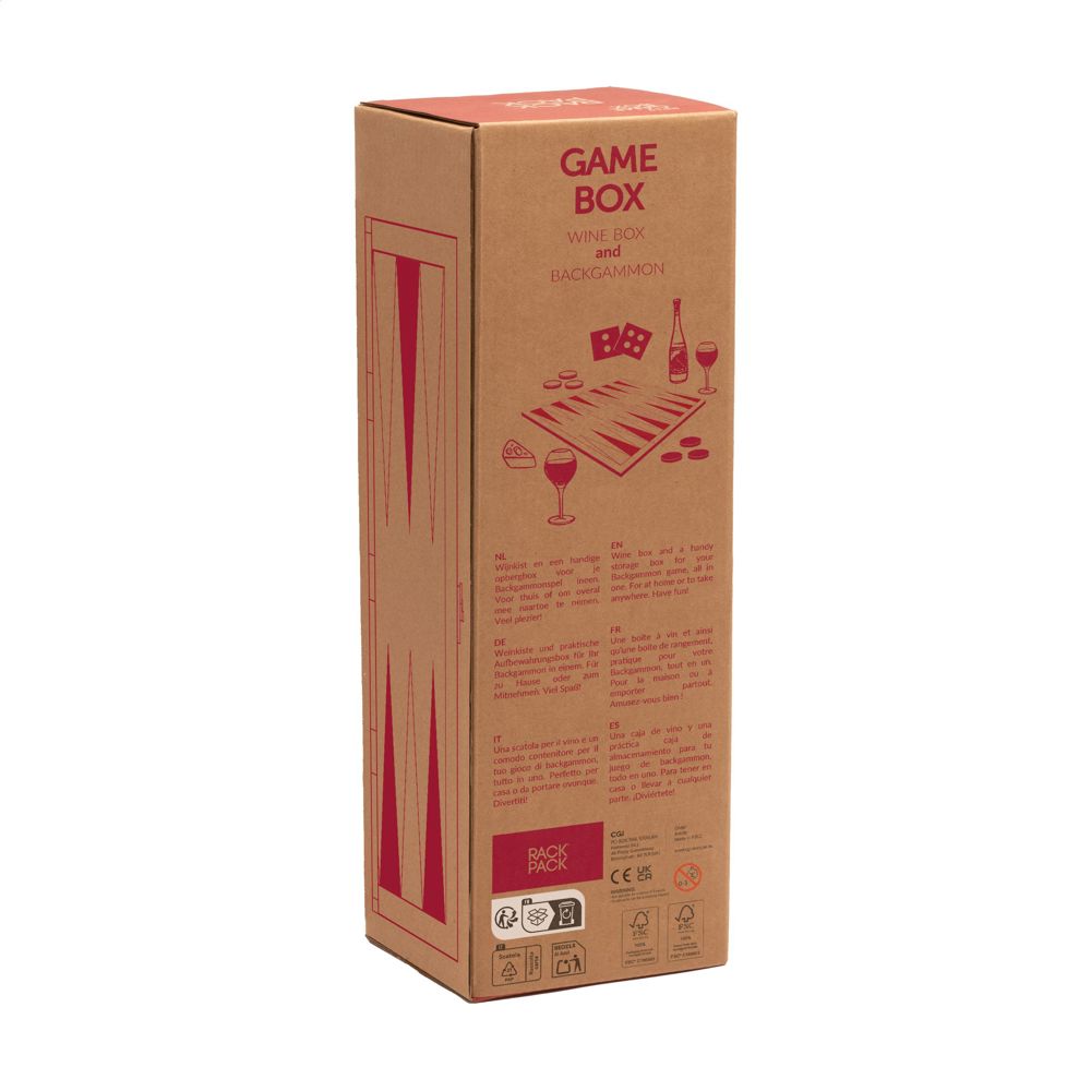 Rackpack Gamebox Backgammon: een wijnkist en backgammonspel in één. Een cadeauverpakking voor één fles wijn. Klap de box open voor een compleet bordspel. Wordt geleverd met houten speelstukken in een stevige, canvas opbergzak. Een compleet geschenk voor een geslaagde spelletjesavond. Rackpack: een wijngeschenkkist van FSC 100% gecertificeerd hout met een nieuw tweede leven! • geschikt voor één fles wijn • dennenhout • wijn niet inbegrepen. Per stuk verpakt.