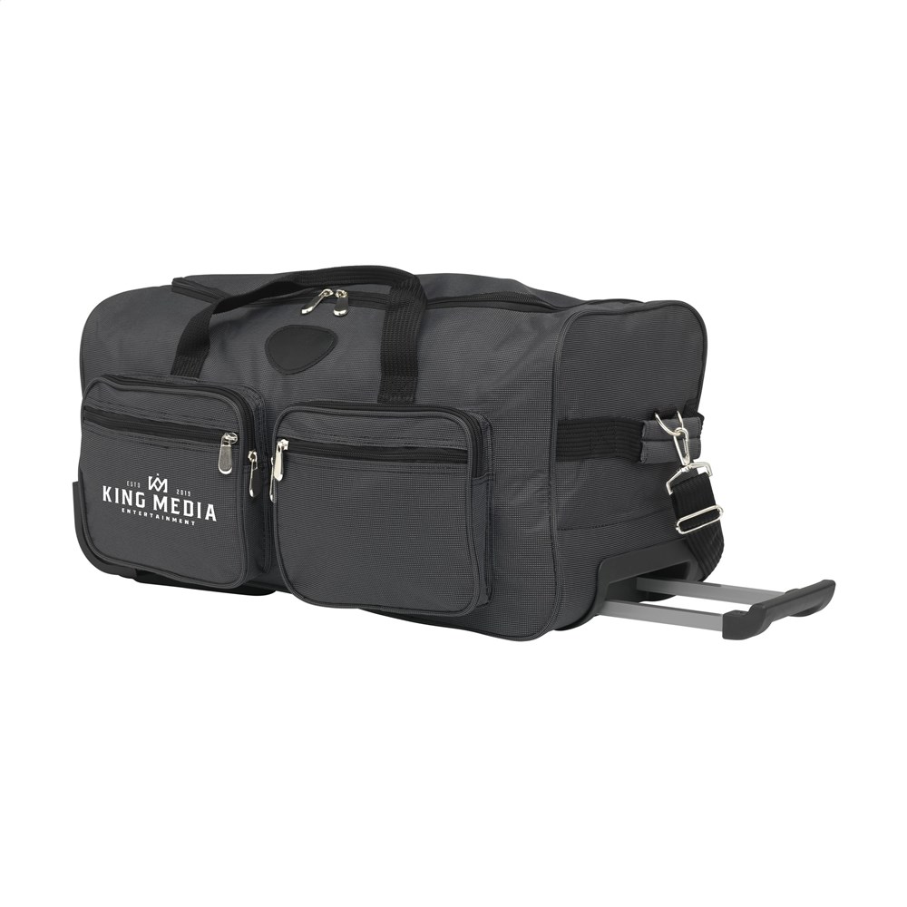 Exclusieve, praktische trolleytas met uitschuifbare handgreep, 2 wielen, royaal hoofdvak en 4 ritsvakken aan de voorzijde. Uitgevoerd in waterafstotend, duotone 600D polyester in carréstructuur en bekleed met een chique voering. Inhoud ca. 31,5 liter.