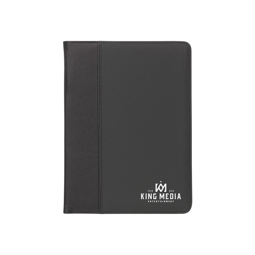 Schrijfmap/documentenmap van 600D polyester/imitatieleer in A4-formaat. Incl. uitneembare solarcalculator met dual power (incl. celbatterij), FSC Mix gecertificeerde schrijfblok en balpen.