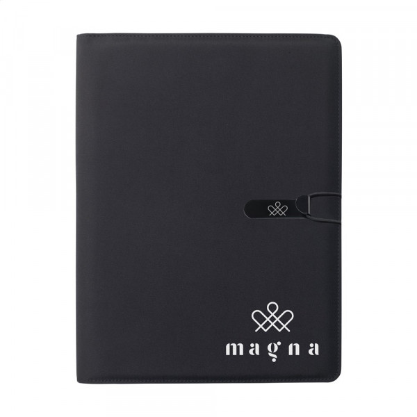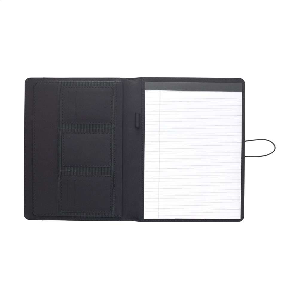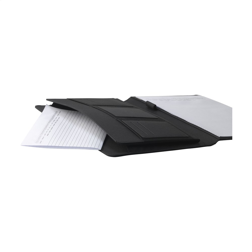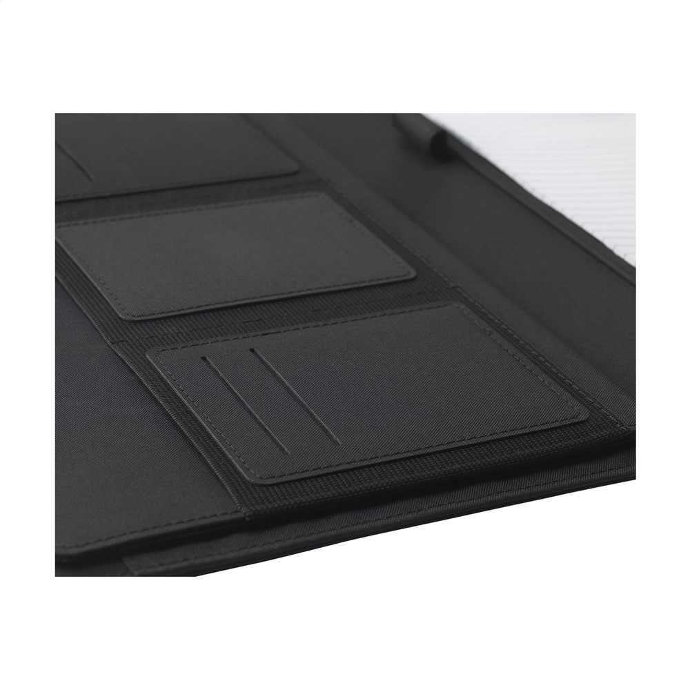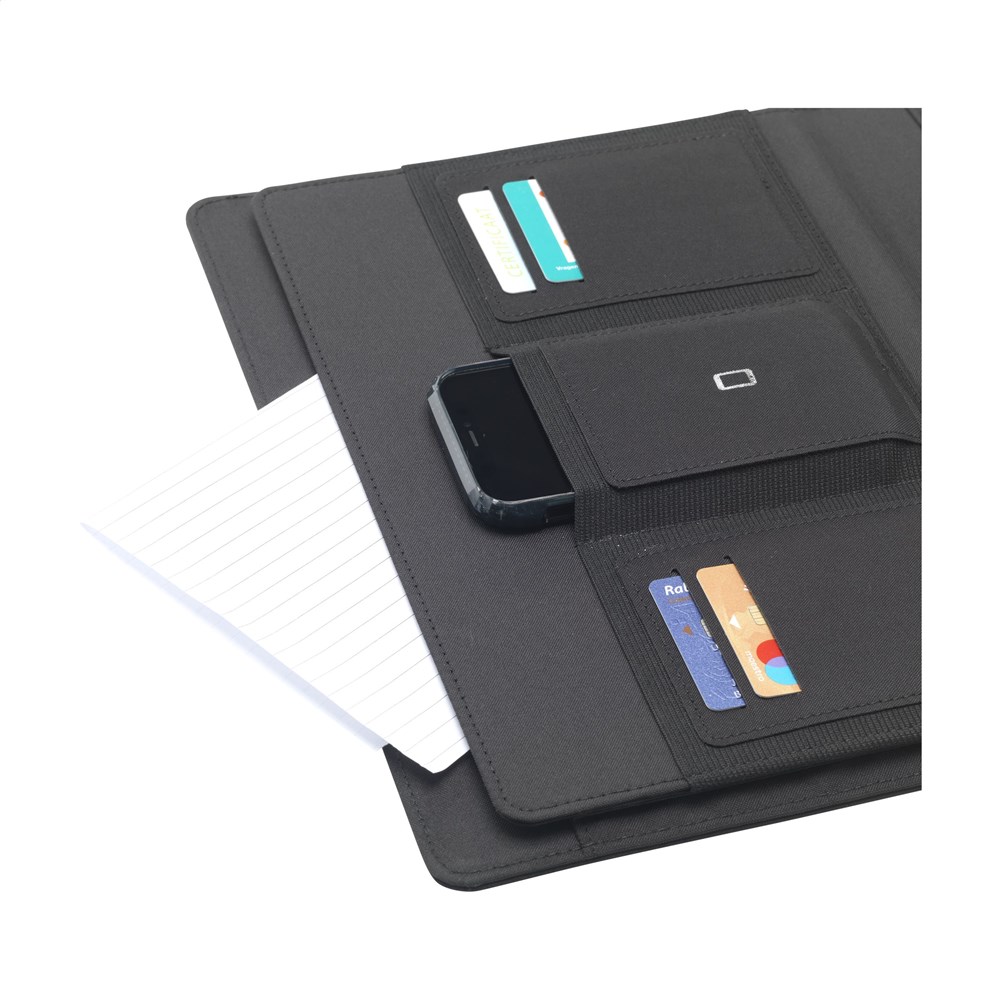 Moderne schrijfmap/documentenmap gemaakt van RPET-materiaal. In A4-formaat. Voorzien van diverse insteekvakken, waaronder een apart vak voor het opbergen van een mobiele telefoon, en een pennenlus. Incl. schrijfblok met 20 vel FSC gecertificeerd, wit gelinieerd papier (70 g/m²). RCS-gecertificeerd. Totaal gerecycled materiaal: 6%.