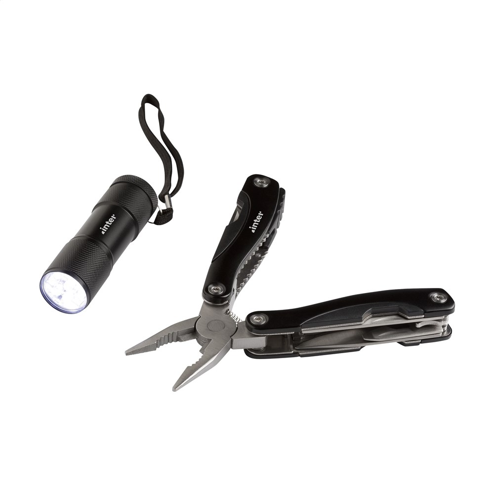 Geschenkset: 9-delige RVS multitang met 12 functies (tang, draadknipper, zaag, 2 schroevendraaiers, blikopener, flesopener, vijl, mes, philips kruiskopschroevendraaier, visschraper, visonthaker) en aluminium handgreep in metallic look. Aluminium staaflamp (Ø 2,7 x 9 cm) met 9 felwitte, energiezuinige LED-lampjes en afneembare lus. Incl. celbatterijen. Op het bezit en/of dragen van messen of multitools in het openbaar kunnen lokale regels van toepassing zijn. Per set in doos.