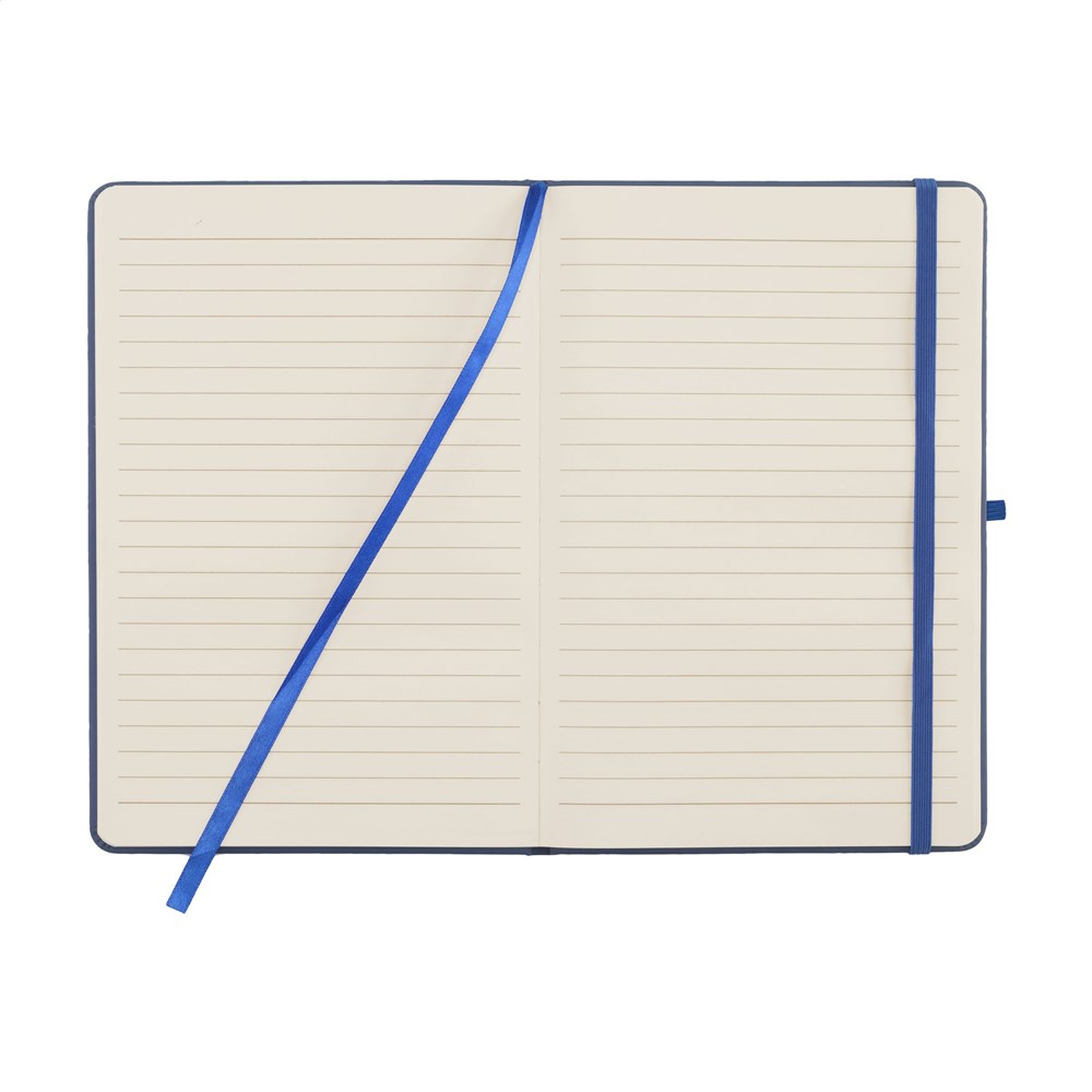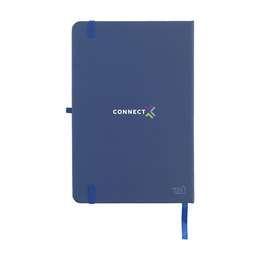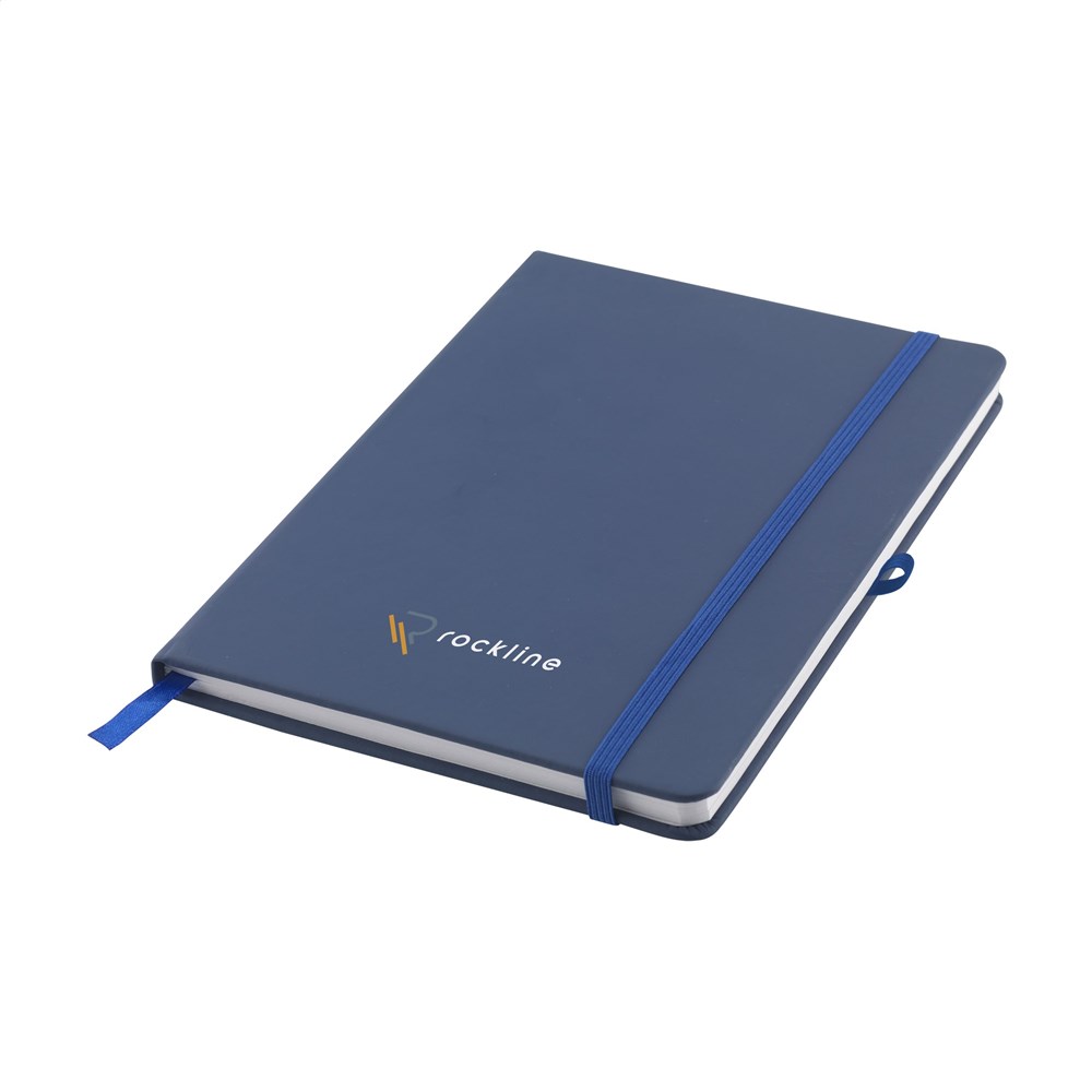 Praktisch notitieboek in A5-formaat. Met harde RPET-cover en ca. 80 vel/160 pagina's crèmekleurig, gelinieerd papier (70 g/m²). Met handige sluitelastiek, leeslint en pennenlus.