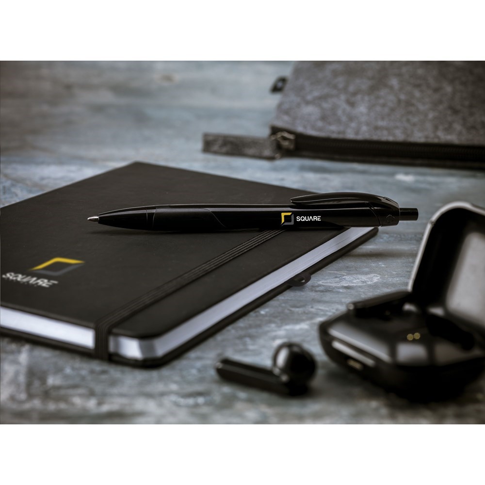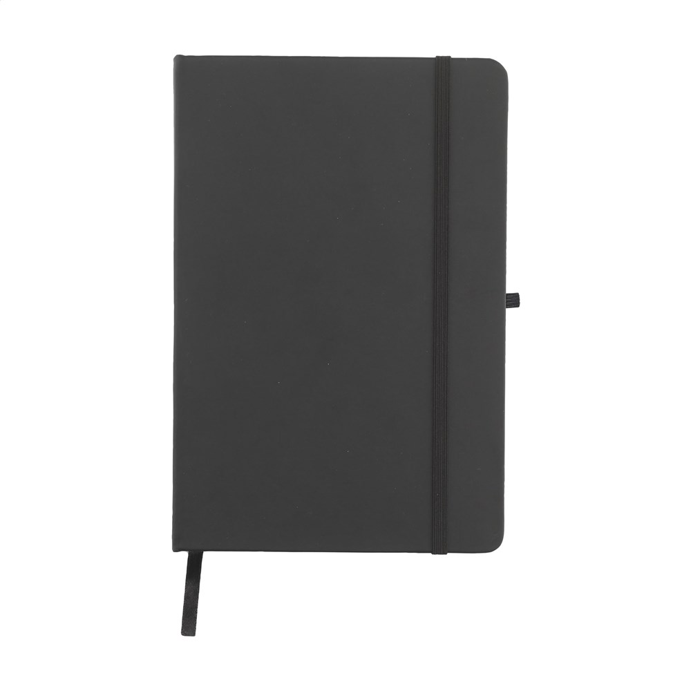 Praktisch notitieboek in A5-formaat. Met harde RPET-cover en ca. 80 vel/160 pagina's crèmekleurig, gelinieerd papier (70 g/m²). Met handige sluitelastiek, leeslint en pennenlus.