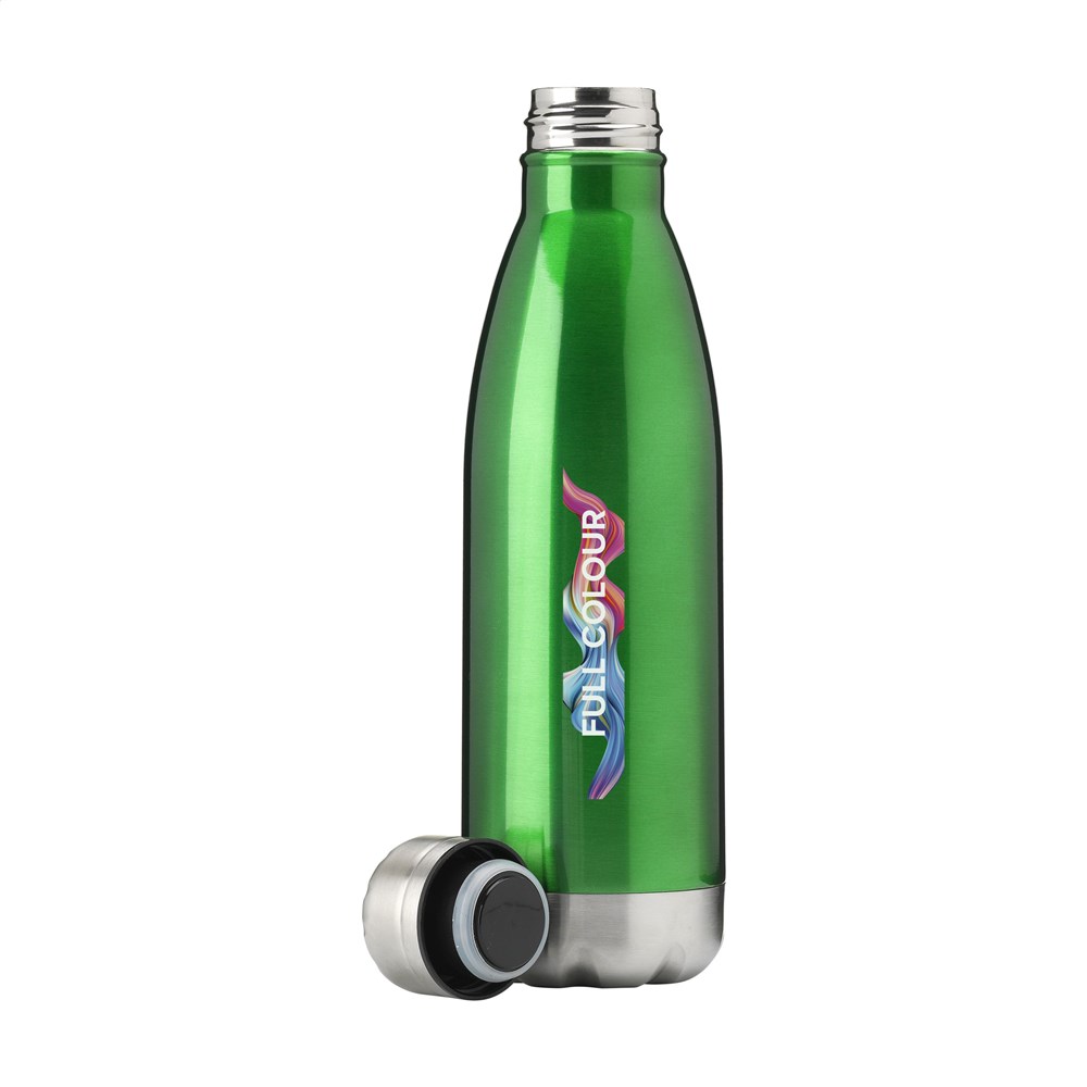 Dubbelwandige, vacuüm geïsoleerde, RVS waterfles/thermosfles. Met lekvrije schroefdop. Uitgevoerd in metallic of met mooie toplaag in matte finish (alleen de zwarte en de witte). Geschikt voor het op temperatuur houden van koud of warm water. Niet vaatwasserbestendig. Inhoud 500 ml. Per stuk verpakt.