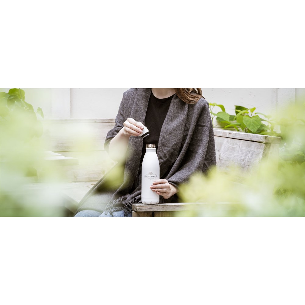 Dubbelwandige, lekvrije waterfles/thermosfles van gerecycled RVS. Deze fles is met zijn trendy, matte finish een opvallend mooie verschijning. Met draaidop in dezelfde kleur. Deze slanke fles past in de bekerhouder van nagenoeg alle auto’s en is een perfecte dorstlesser voor onderweg. Niet vaatwasserbestendig. RCS-gecertificeerd. Totaal gerecycled materiaal: 85%. Inhoud 500 ml. RVS kan vele malen gerecycled worden terwijl de kwaliteit van het materiaal grotendeels behouden blijft. Door het gebruik van gerecycled RVS worden minder nieuwe grondstoffen gebruikt. Dit betekent minder energieverbruik en minder gebruik van water. Per stuk verpakt.