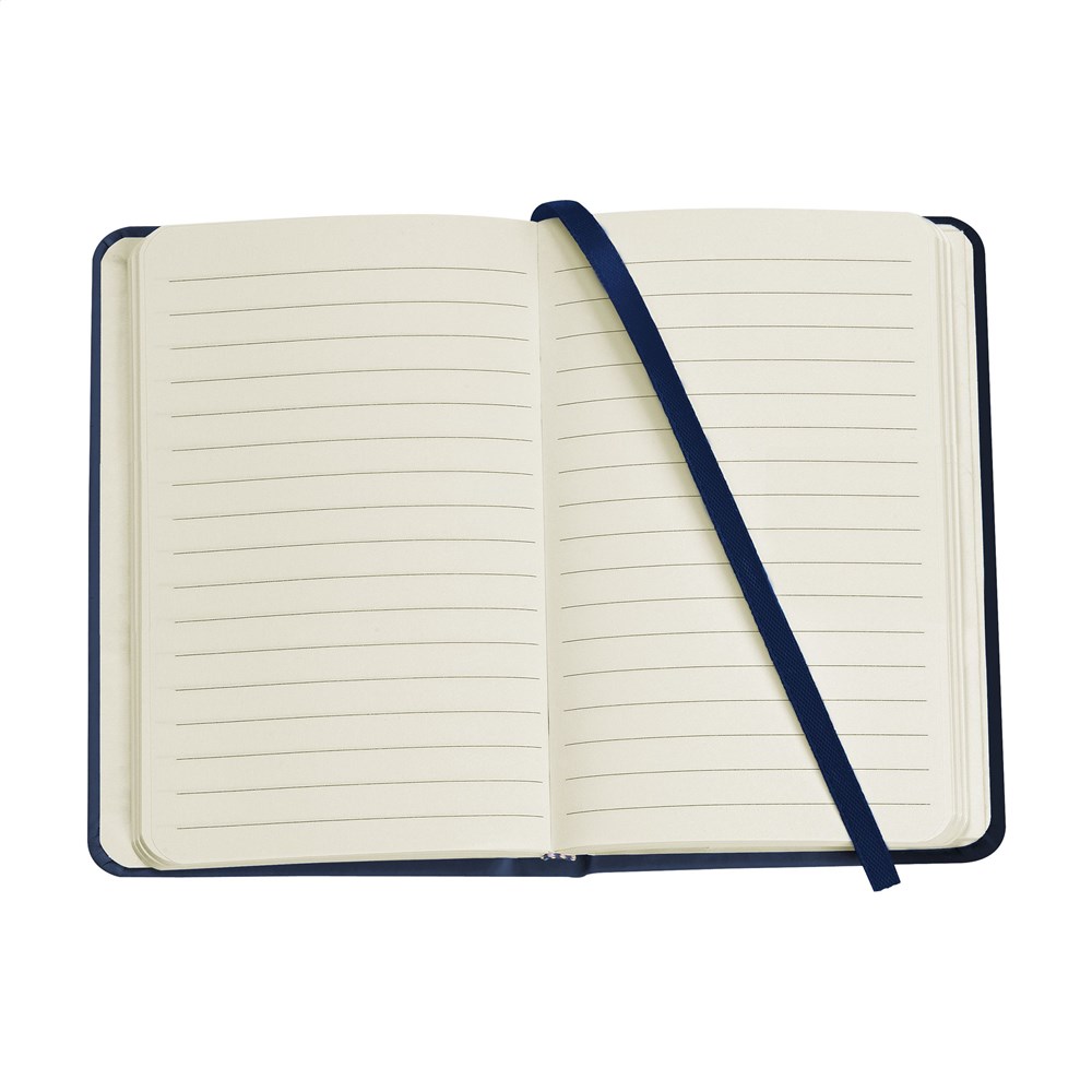 Compact notitieboekje in A6-formaat met ca. 96 vel/192 pagina's crèmekleurig, gelinieerd FSC Mix gecertificeerd papier (80 g/m²). Met gebonden rug, harde kaft, opbergvak, sluitelastiek en zijden leeslint.