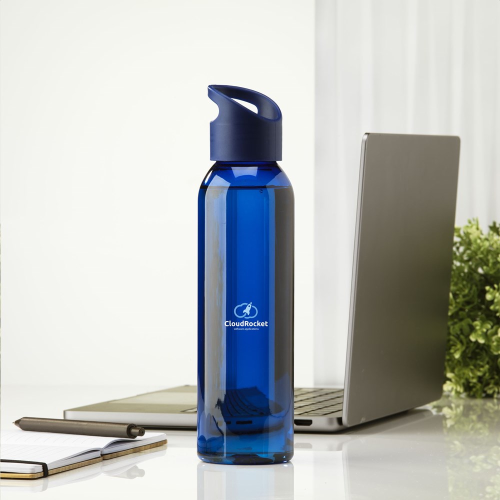Luxe waterfles van helder RPET. Met praktische, kunststof schroefdop. Llekvrij en herbruikbaar. Niet vaatwasserbestendig. Inhoud 650 ml. GRS-gecertificeerd. Totaal gerecycled materiaal: 82%.