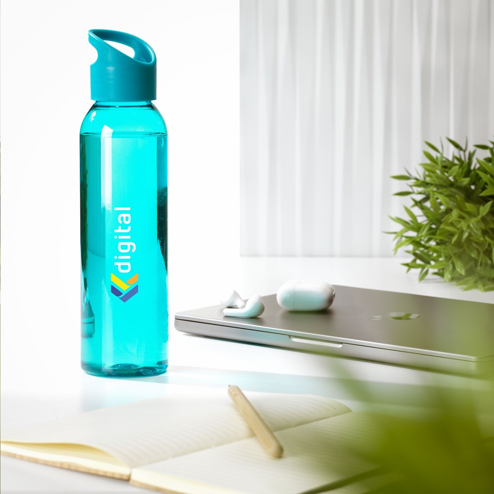 Luxe waterfles van helder RPET. Met praktische, kunststof schroefdop. Llekvrij en herbruikbaar. Niet vaatwasserbestendig. Inhoud 650 ml. GRS-gecertificeerd. Totaal gerecycled materiaal: 82%.